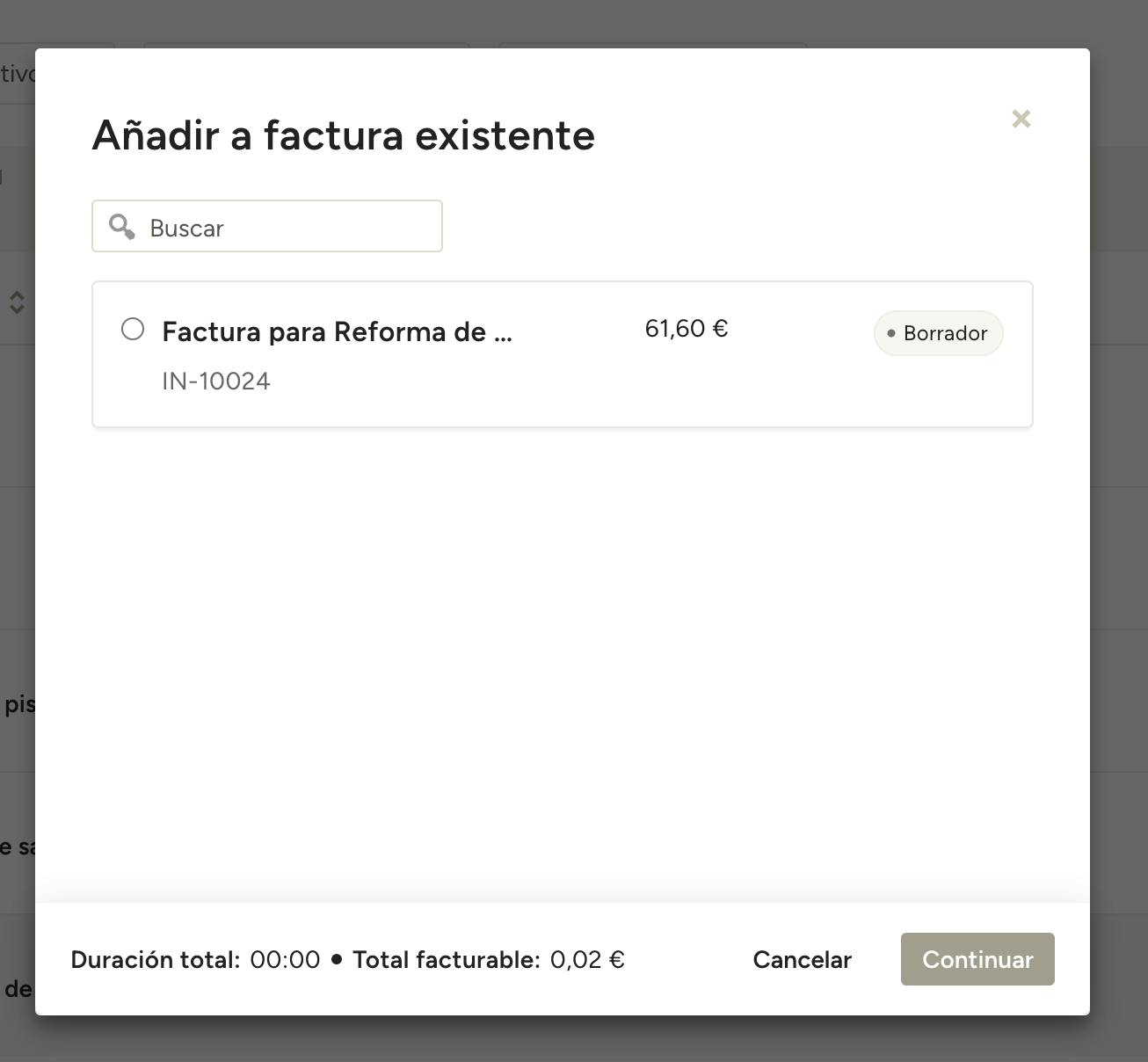 - En el modal que aparece, selecciona la factura a la que deseas añadir la(s) entrada(s). Utiliza la barra de búsqueda de la parte superior para encontrar rápidamente la correcta