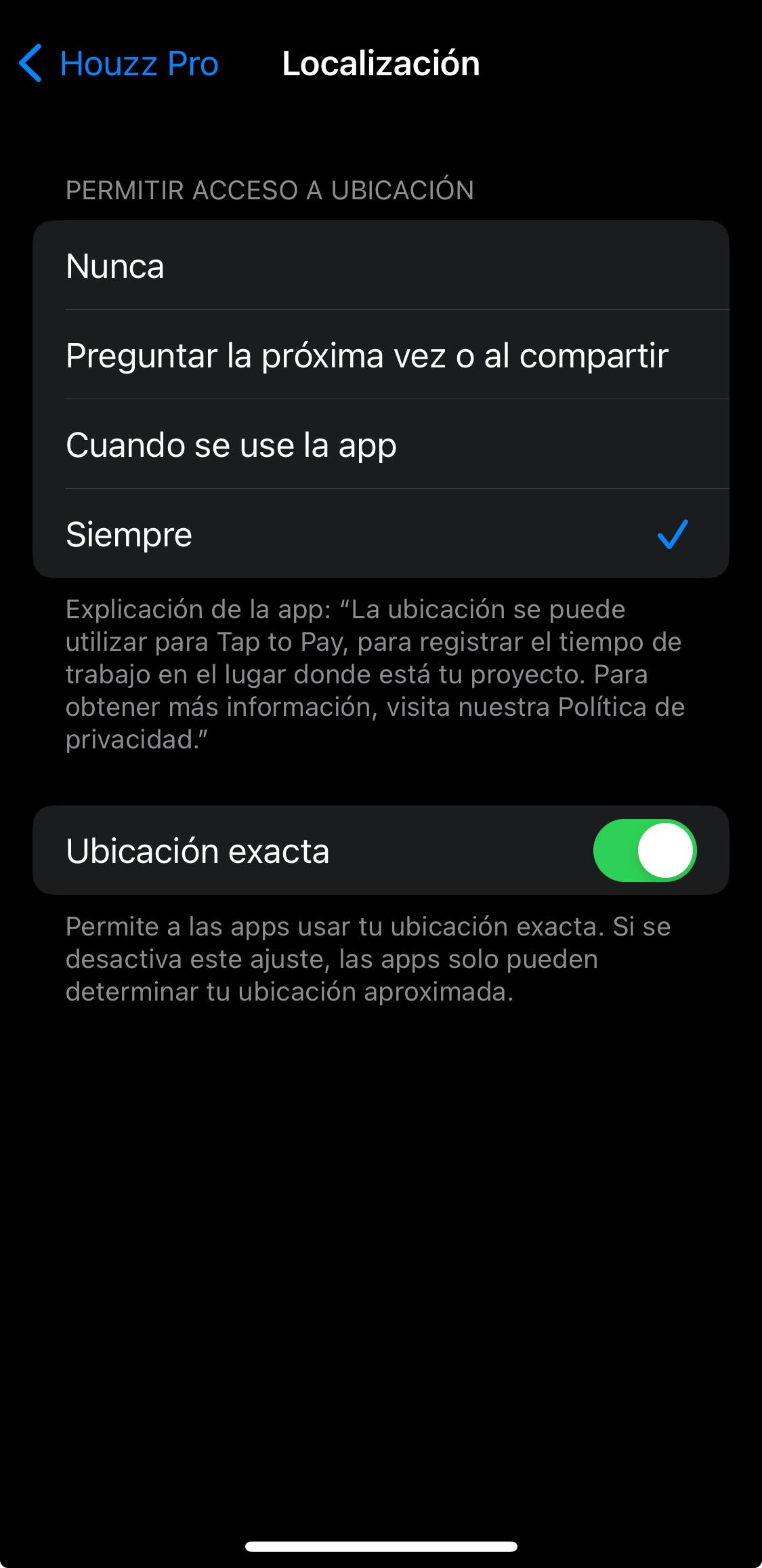 Opción 2: Busca la app de Houzz Pro en la configuración de tu dispositivo móvil y toca Localización. Aquí puedes elegir entre "Cuando se use la app" o "Siempre". Recomendamos la segunda opción incluso si antes habías optado por "Permitir durante el uso" a través de la app en la opción 1 descrita arriba. Si permites el acceso a la ubicación siempre, tu dispositivo podrá detectar cuándo te encuentras cerca de un proyecto y te enviará un aviso para registrar la entrada y la salida, de forma que nunca olvidarás anotar el tiempo.