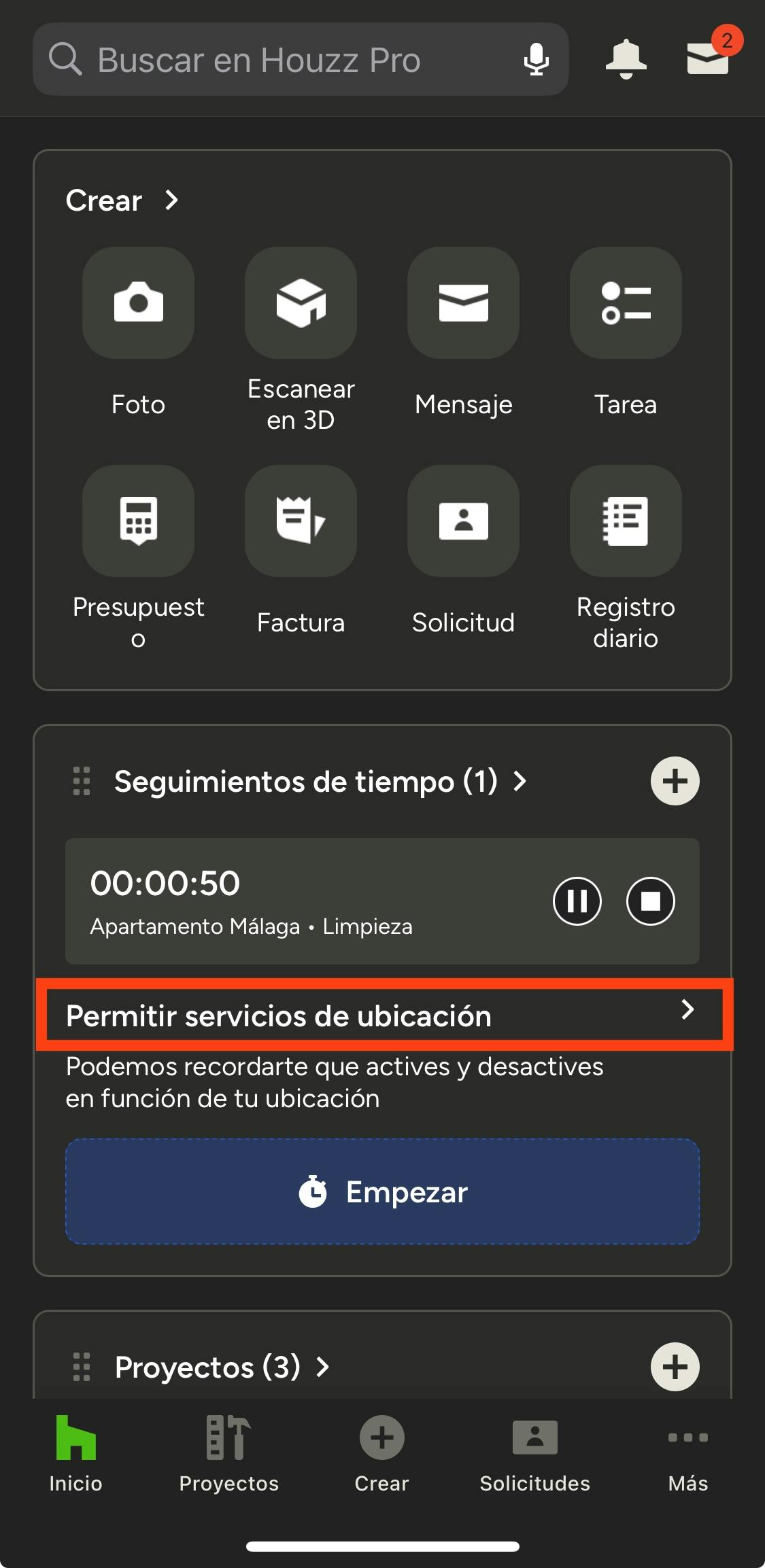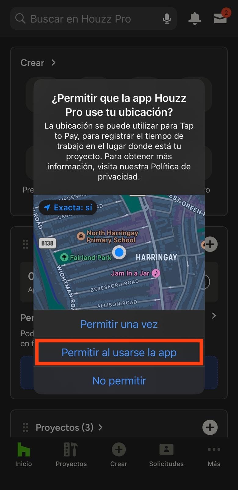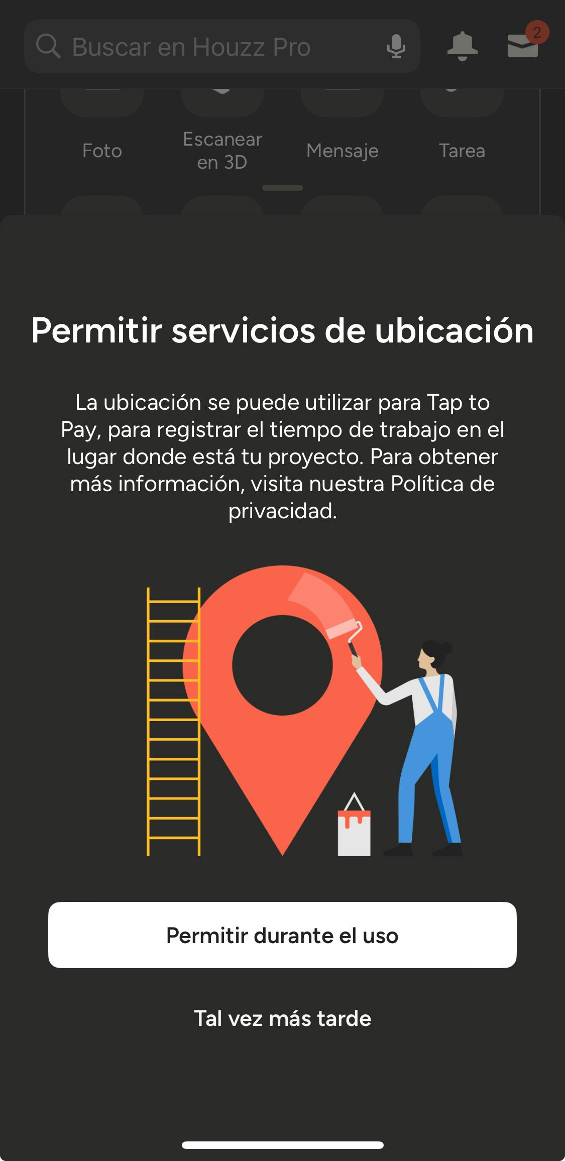Para disfrutar de esta funcionalidad, debes permitir los servicios de ubicación para la app de Houzz Pro.