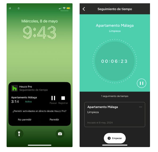 - 150 m: Se mostrará una notificación para registrar el tiempo cuando te encuentres cerca de su ubicación. Aparecerá dentro de la app y también como notificación push si las tienes activadas para la app de Houzz Pro.