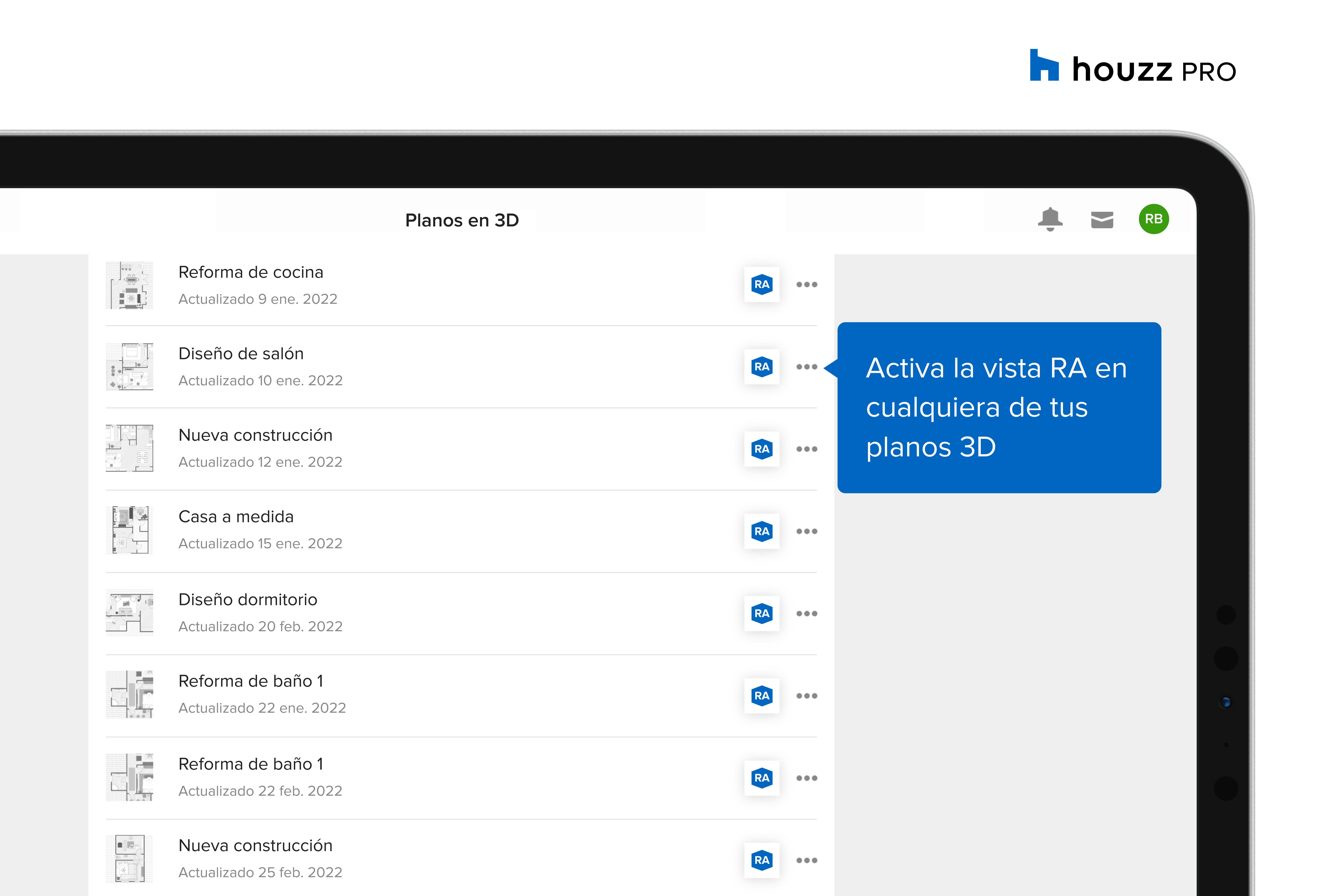 Con las visitas virtuales Houzz Pro puedes ayudar a tus clientes a visualizar cómo quedará un espacio tras un proyecto de reforma. Podrás sumergir a tus clientes en un recorrido virtual del proyecto terminado desde la comodidad de la aplicación Houzz Pro en tu teléfono móvil o tablet.