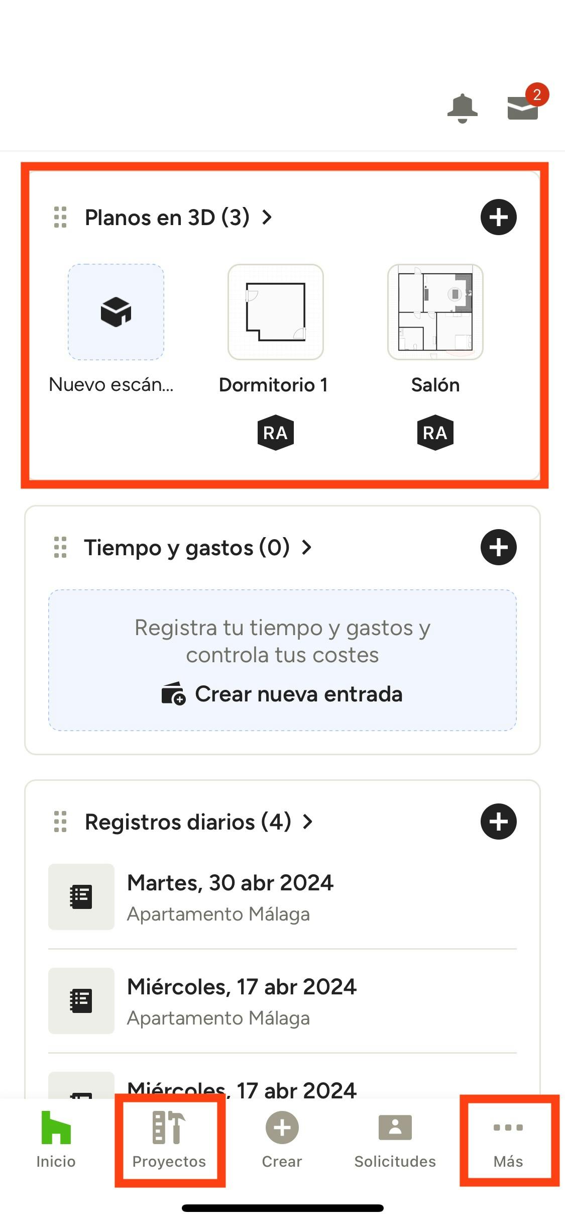 Para ver un plano en 3D, abre la app de Houzz Pro. Desde la página principal puedes: