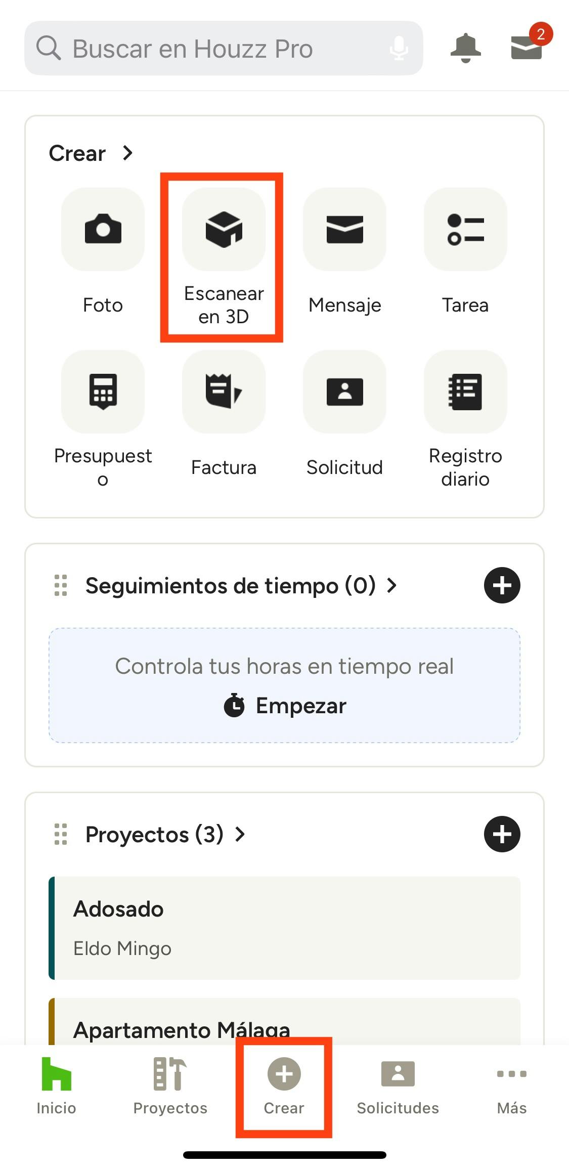 Para crear un plano en 3D a través de la opción Escanear en 3D, abre la app de Houzz Pro. Desde la página principal podrás hacerlo desde dos lugares: