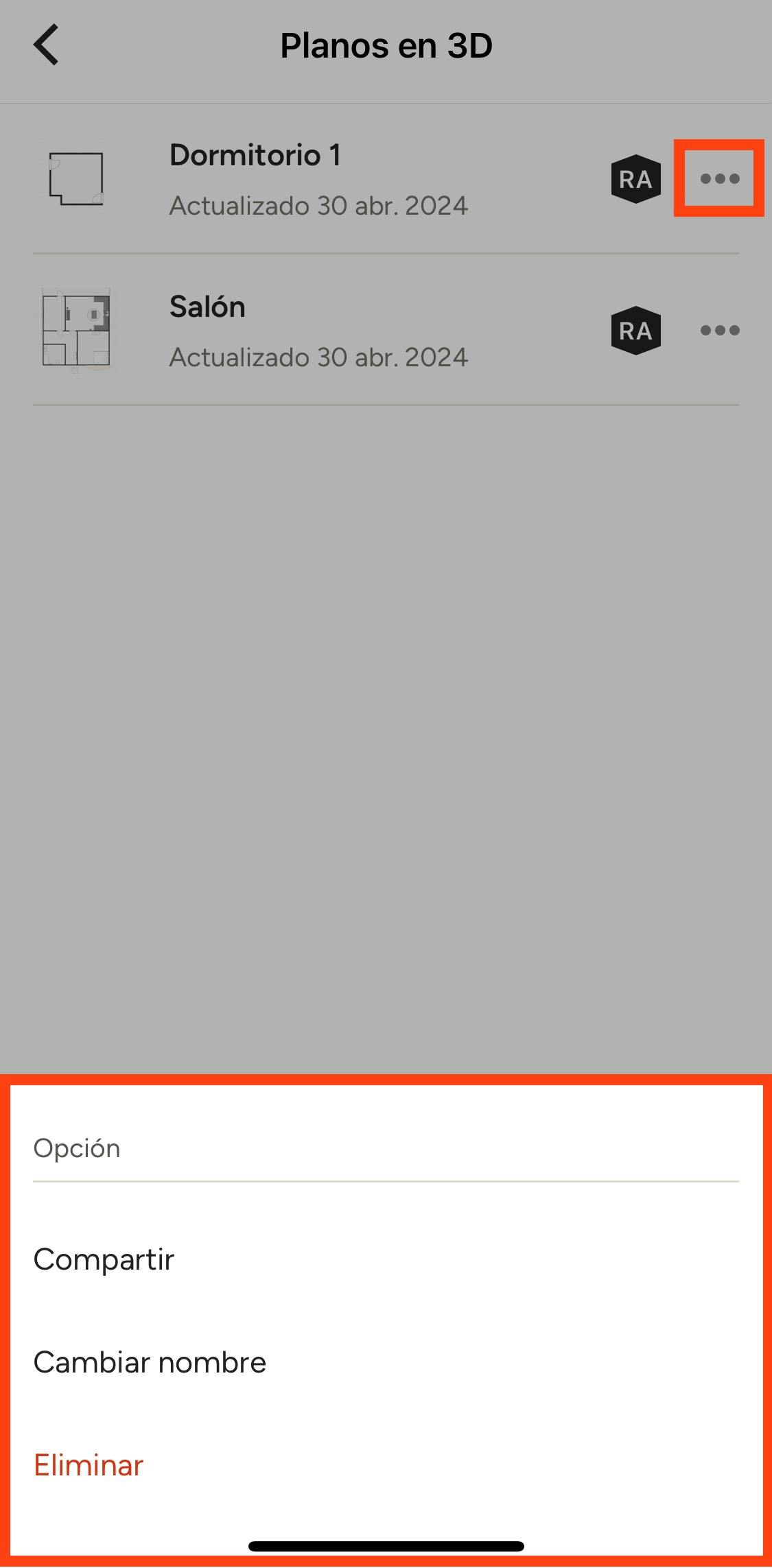 Desde la lista de planos en 3D también puedes seleccionar el icono con forma de tres puntos junto a cada plano para compartirlo, cambiarle el nombre o eliminarlo.