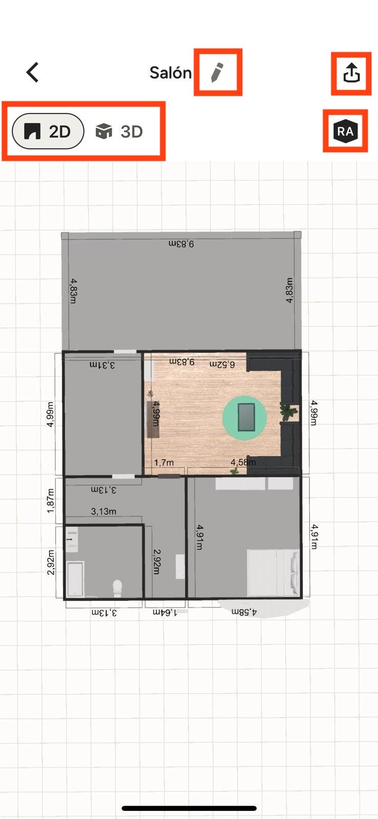- Realiza mediciones con la regla directamente sobre el plano tocando el icono de la regla en la parte inferior de la pantalla.