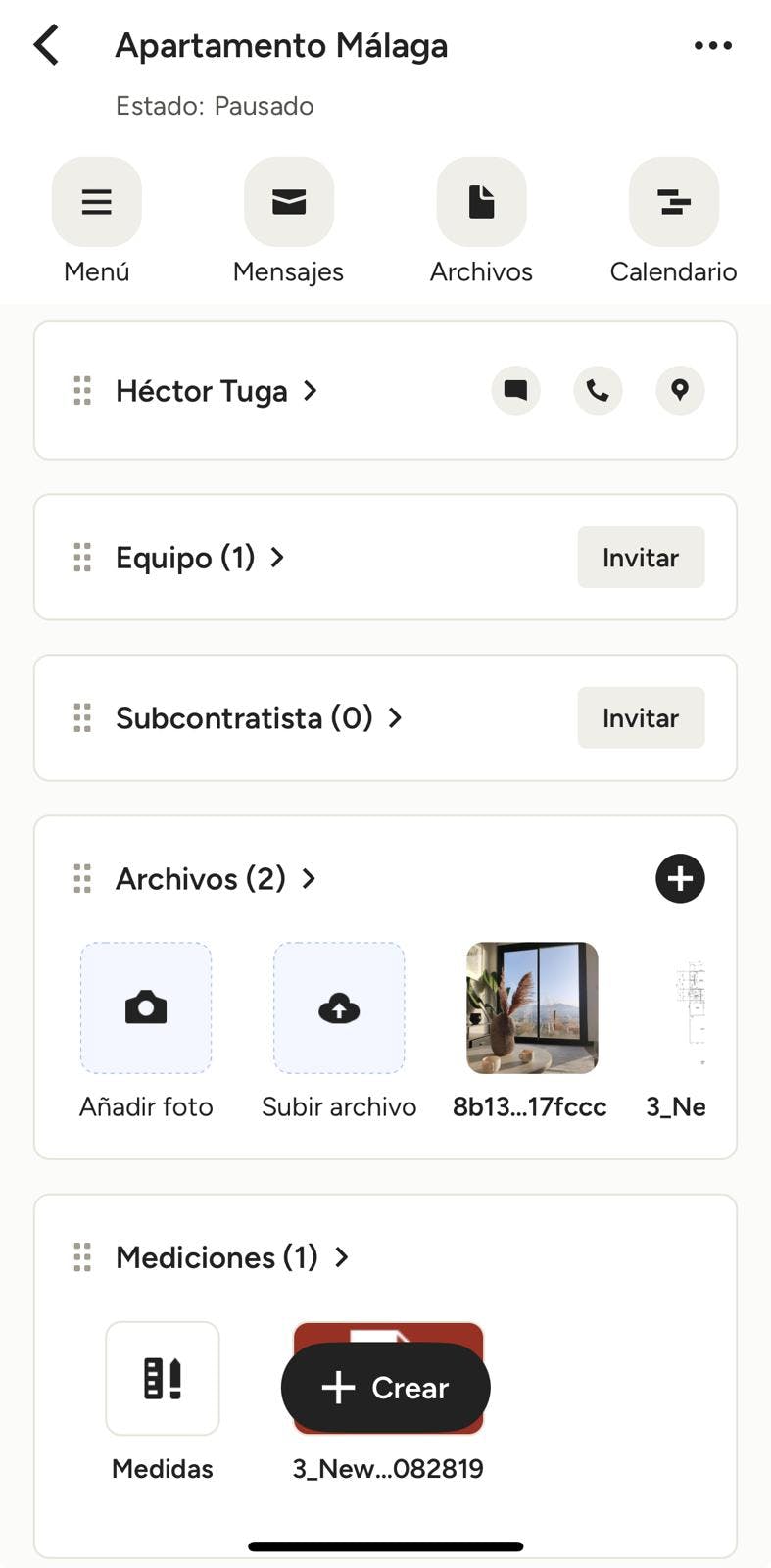 - Proyectos: Consulta y edita detalles de proyectos o archívalos, visualiza y modifica la información de los clientes, envíales mensajes y sube archivos.