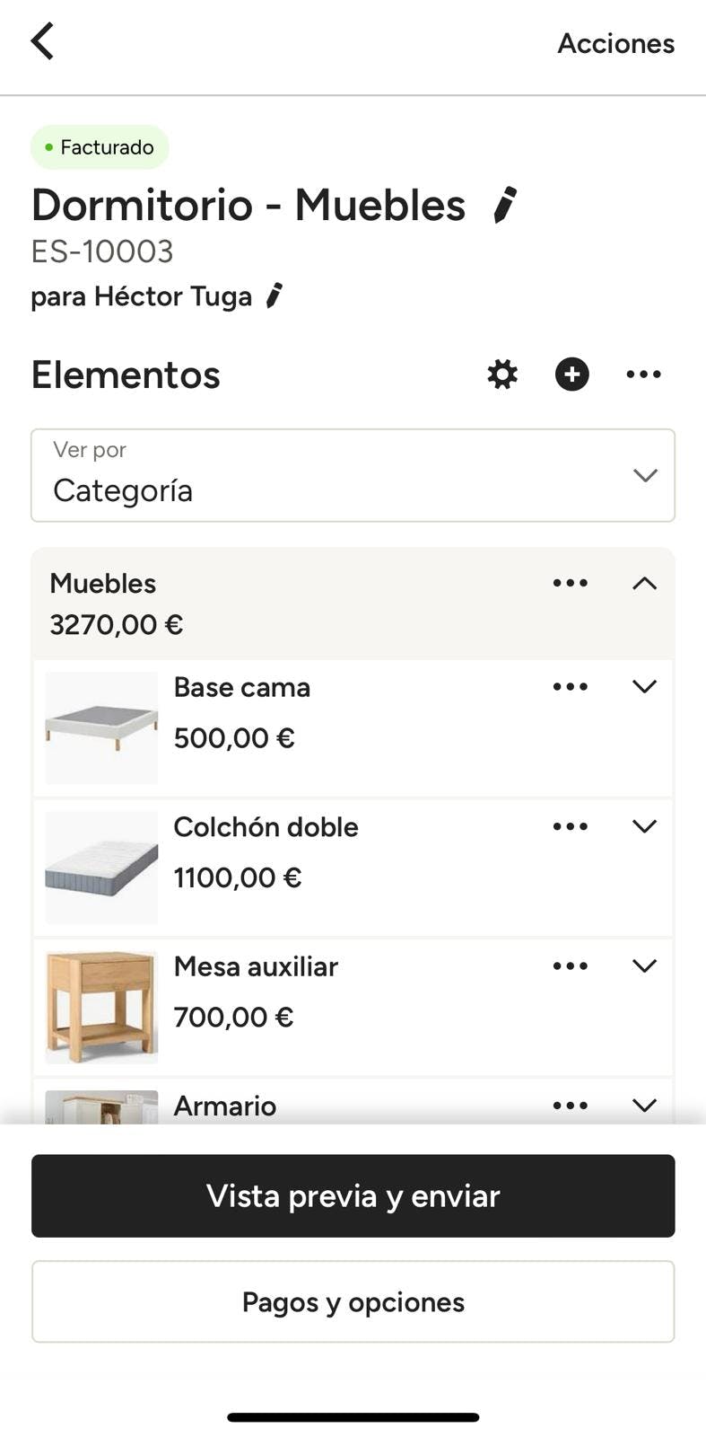 - Presupuestos: Consulta y edita presupuestos, crea otros nuevos, apruébalos o recházalos, conviértelos en facturas, programa pagos, accede a vistas previas y envíalos.