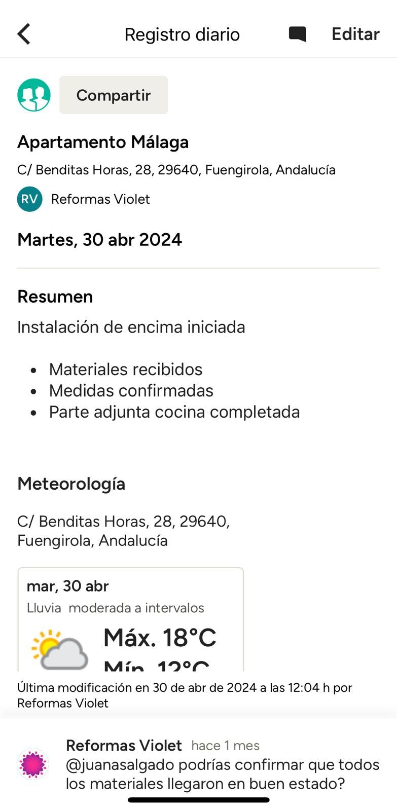 Dentro de la app de Houzz Pro puedes ver, editar y crear registros diarios para realizar un seguimiento del progreso de tus proyectos. También puedes comentar en estos registros, compartirlos con tus clientes o tu equipo, y borrarlos o duplicarlos si quieres volver a usarlos con un formato específico.