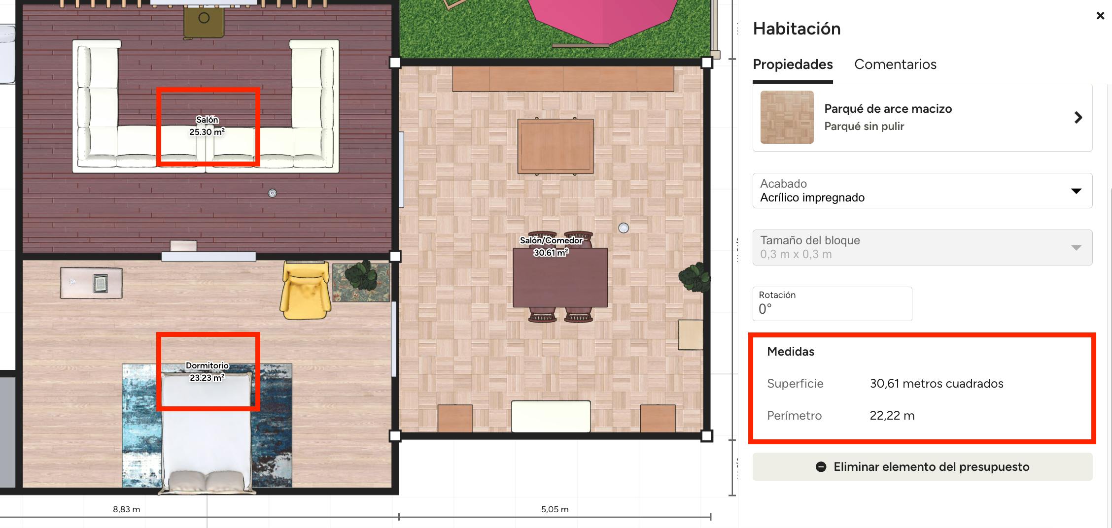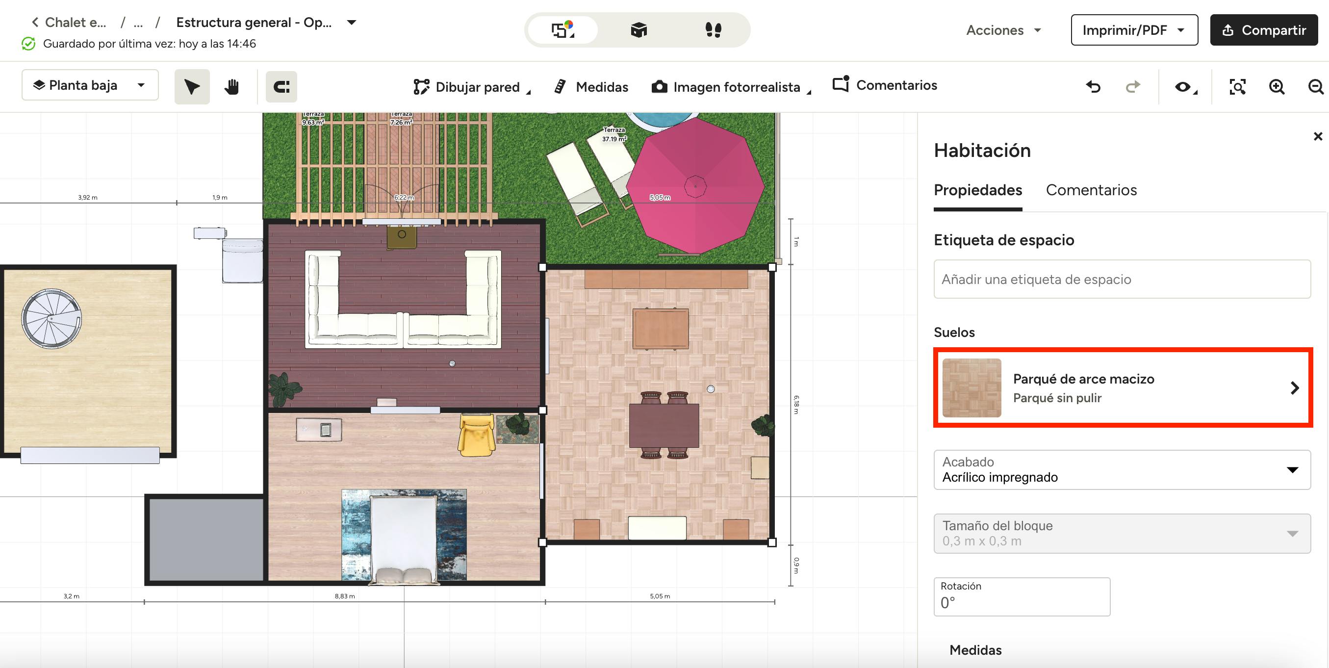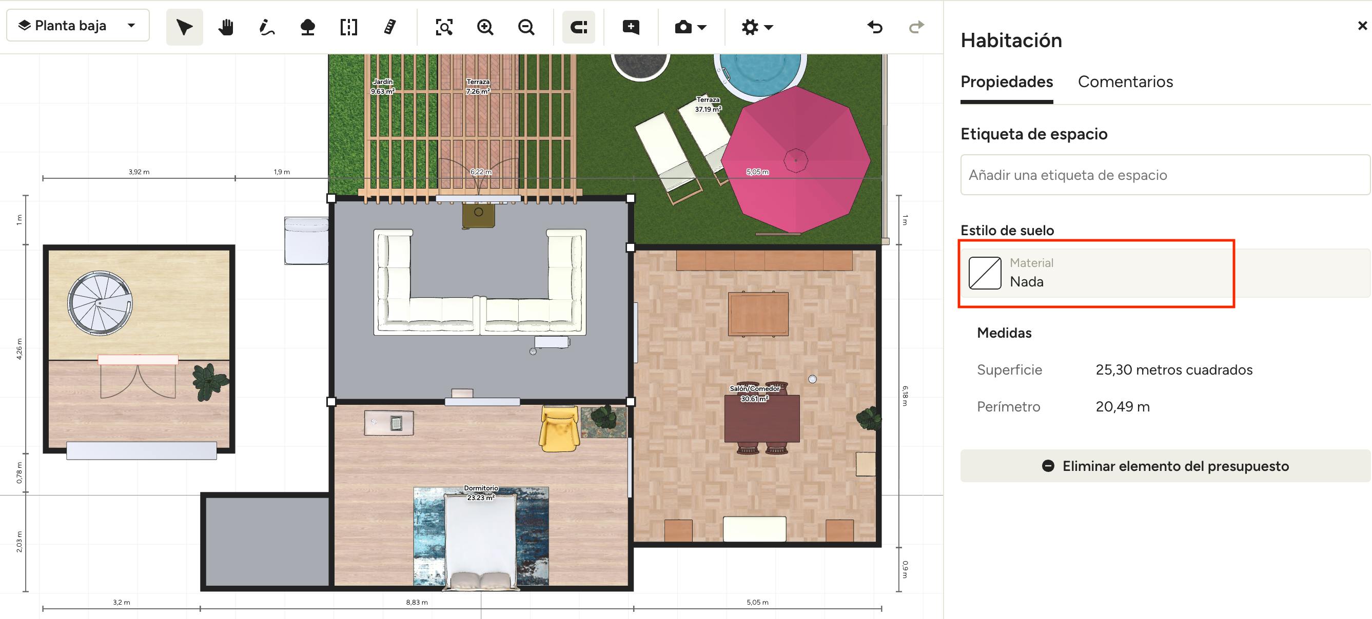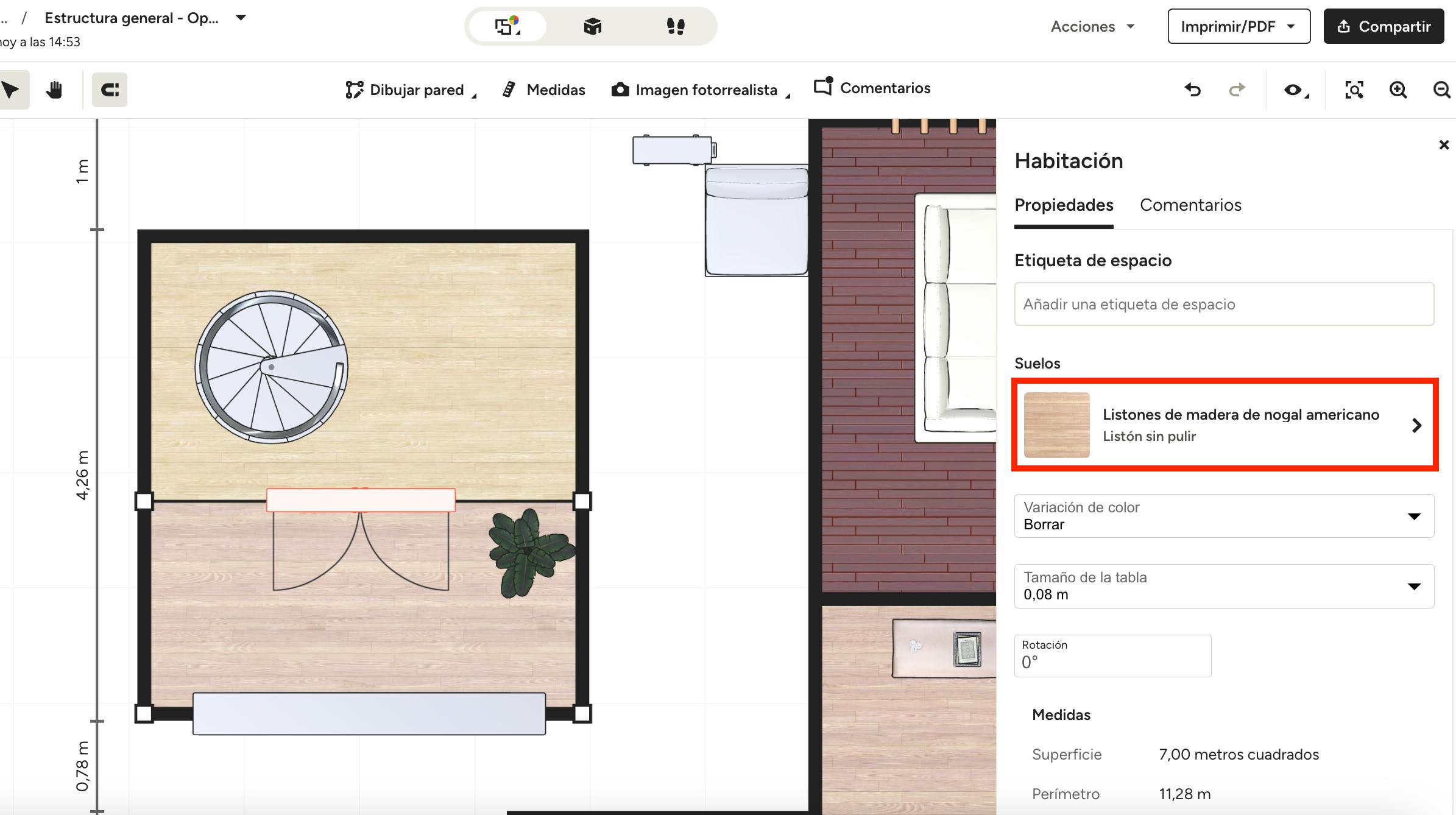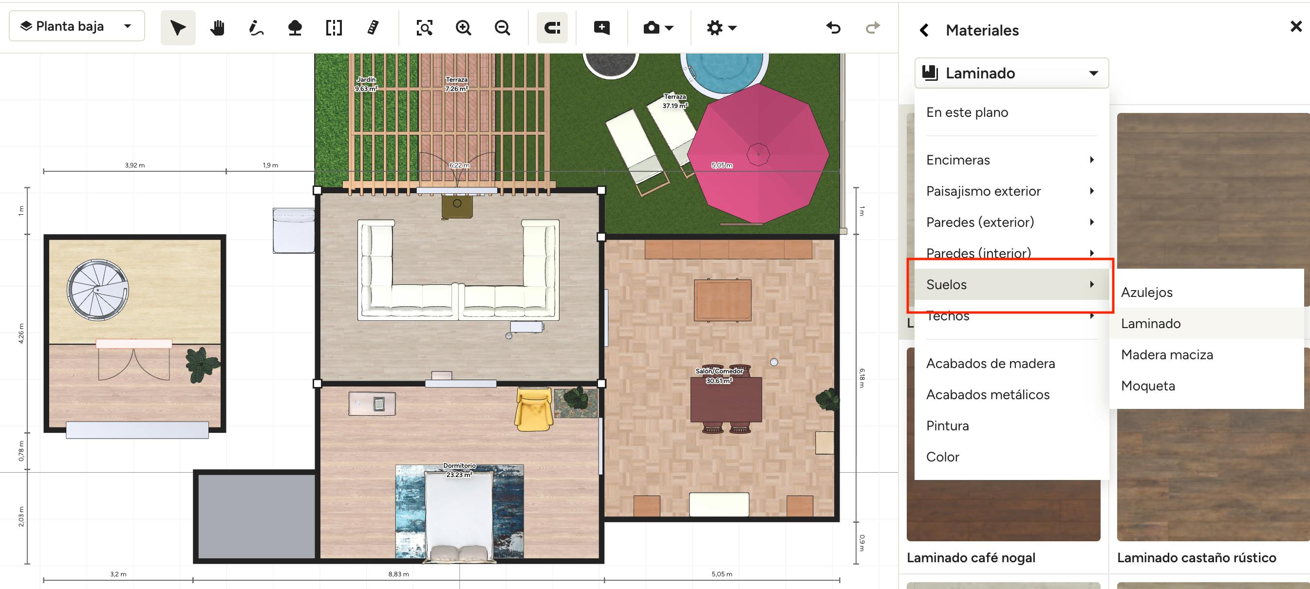 Si ya has seleccionado un suelo, ya sea de una plantilla o un diseño tuyo, puedes ajustarlo fácilmente si lo necesitas. Solo tienes que hacer clic en el suelo y pulsarlo en el menú lateral derecho. Se abrirá la biblioteca de suelos para que puedas realizar cambios.