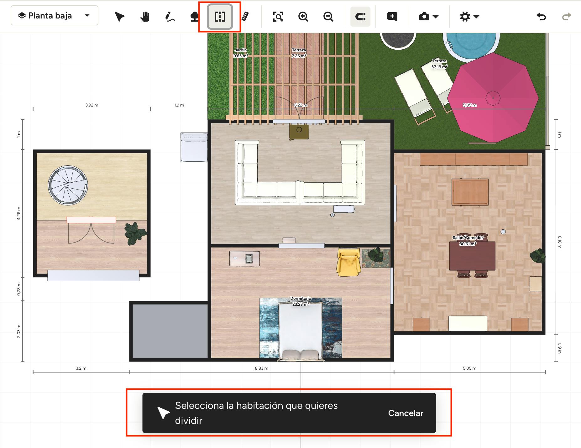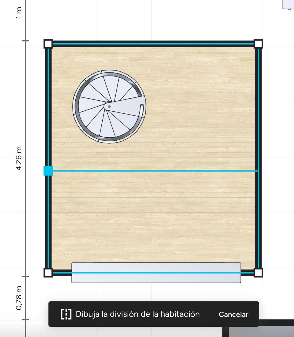 Para empezar, selecciona el icono Dibujar división de habitación de la barra de herramientas de tu plano 3D. Se te pedirá que selecciones la habitación que deseas dividir.