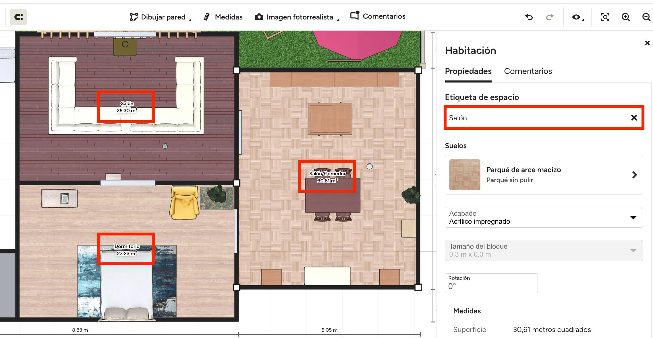 En el menú derecho también podrás modificar la etiqueta de espacio. Cuando dividas una habitación, podrás ver las etiquetas específicas dentro del plano de concepto abierto. Además, también podrás hacerlo cuando los materiales del suelo sean diferentes en la misma habitación.