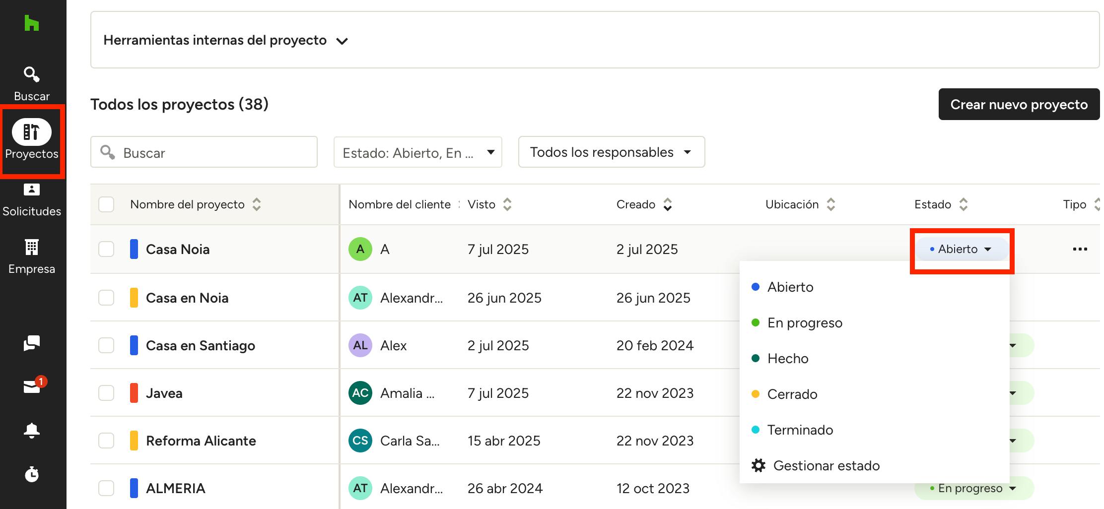 También puedes abrir un proyecto individual para modificar su estado. Para acceder a esta opción, haz clic en el icono Proyectos en el menú de navegación izquierdo y elige el que desees.