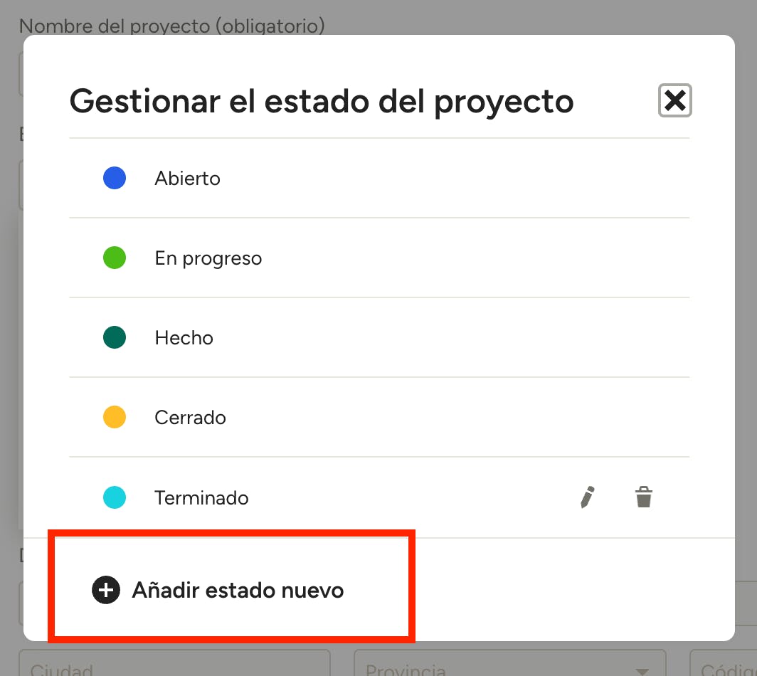 Importante: Si cambias el estado de un proyecto (incluso si le añades el estado de Cerrado), el proyecto no se eliminará. Consulta el artículo Cómo eliminar un proyecto para obtener más información sobre el proceso de eliminación.