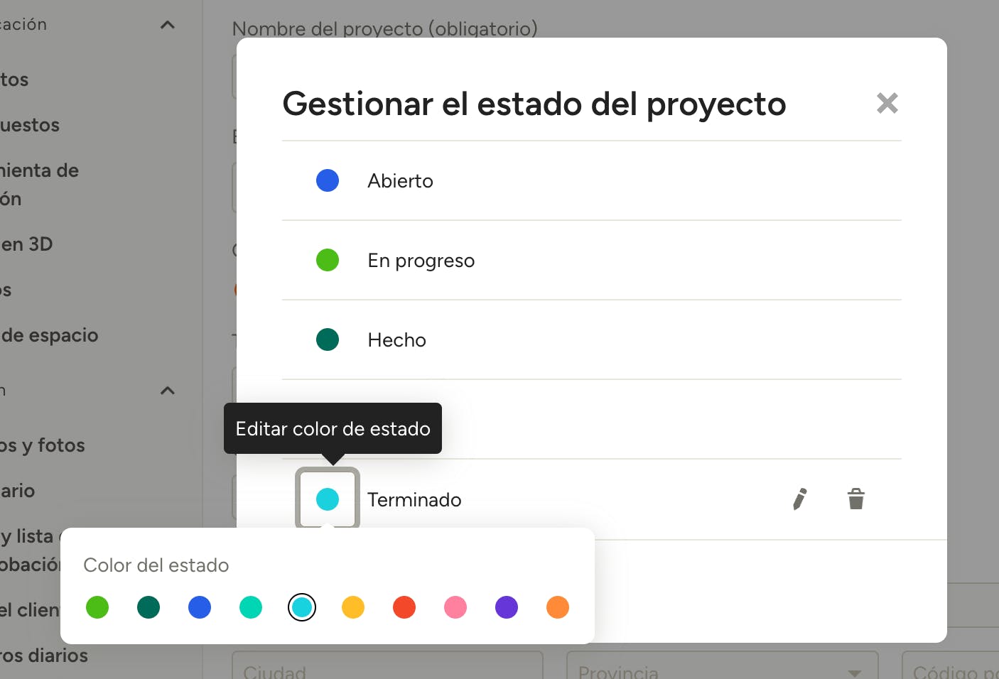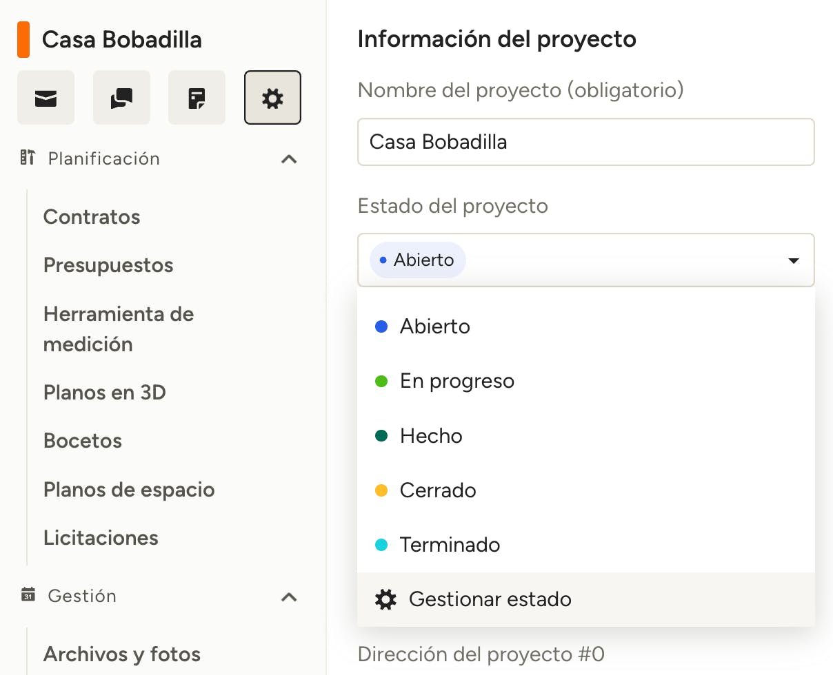 Las opciones de estados de proyectos incluyen Abierto, En progreso, Hecho y Cerrado. Las tres primeras corresponden a proyectos activos que aparecerán en tu lista de proyectos. La última, Cerrado, es para proyectos inactivos que no aparecerán en dicha lista.
