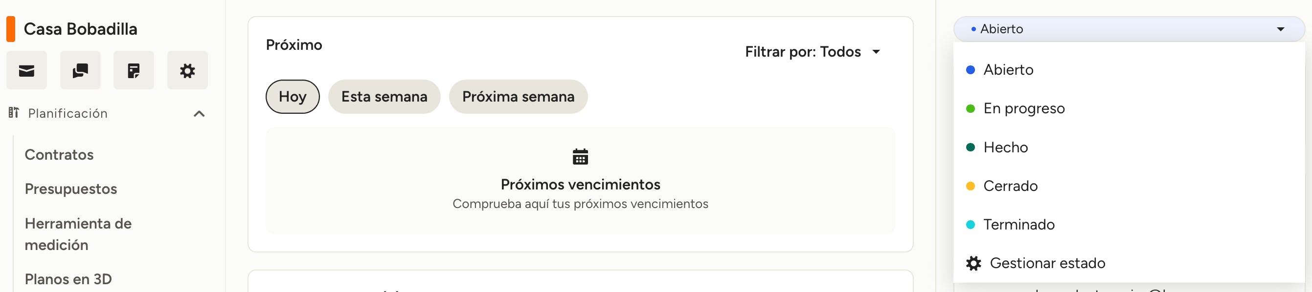 A medida que avances en un proyecto, podrás ajustar fácilmente el estado del mismo para saber en qué punto del proceso te encuentras. Aunque en Houzz Pro hay opciones de estado predeterminadas, también puedes crear estados personalizados para que se adapten mejor a tu flujo de trabajo.