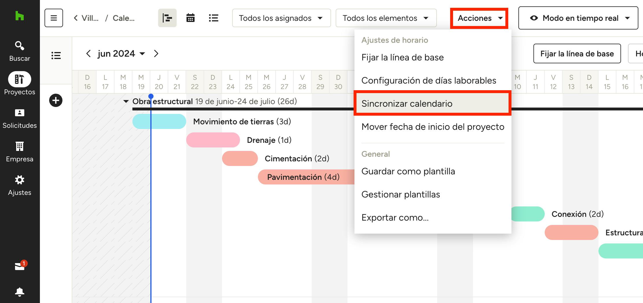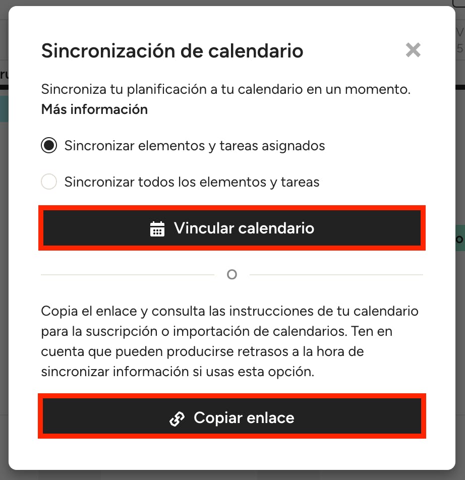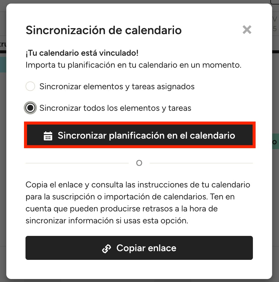Desde la primera, podrás elegir si quieres sincronizar solo los elementos y tareas asignados o bien todos ellos. Elige la que prefieras y pulsa Sincronizar planificación en el calendario.