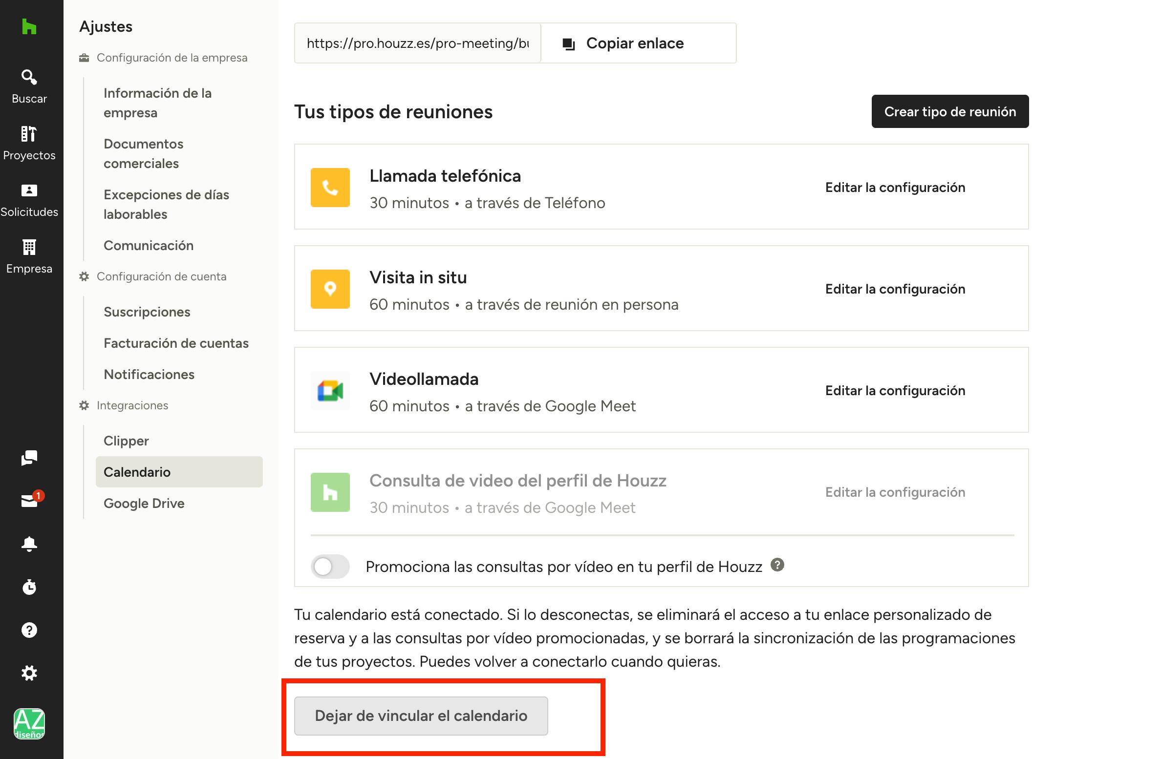 Cuando tu calendario esté vinculado, tus posibles clientes pueden fijar citas fácilmente contigo, y también tienes la posibilidad de crear reuniones con ellos. Tu calendario se sincronizará automáticamente para asegurar que todas tus reuniones se compaginen con tu programación actual. Consulta el artículo Cómo ofrecer reuniones en Houzz Pro para saber más sobre la creación de reuniones y las integraciones de opciones de videollamada.