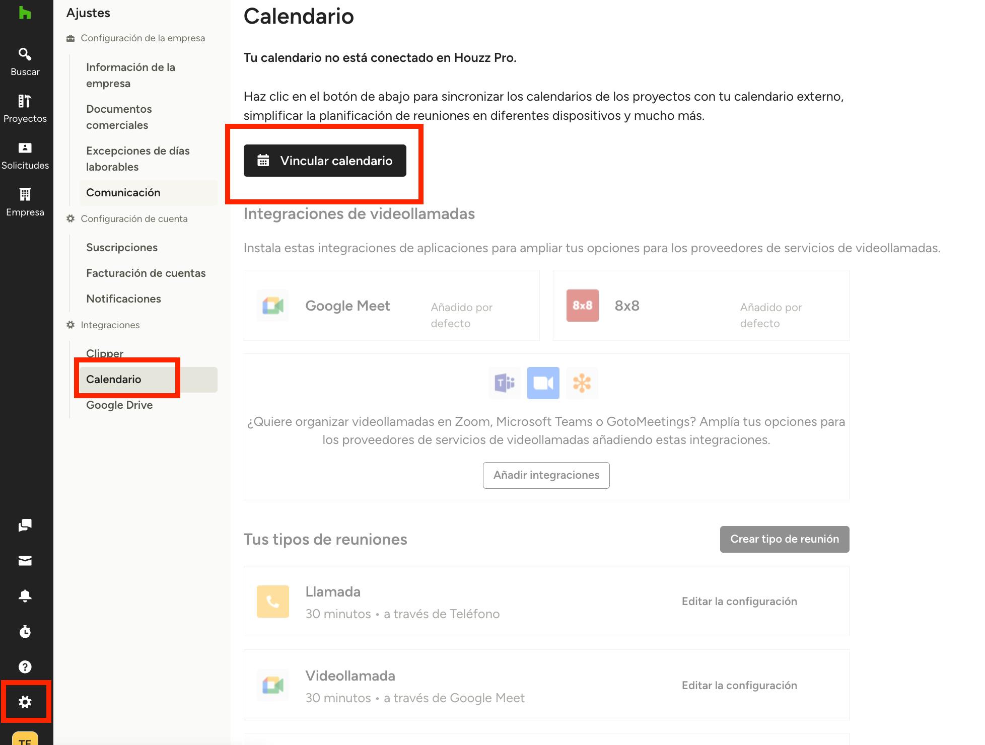 La sección Calendario también mostrará todas las integraciones de videollamadas. Si quieres obtener más información sobre cómo configurarlas y concertar reuniones, consulta el artículo Cómo ofrecer reuniones en Houzz Pro.