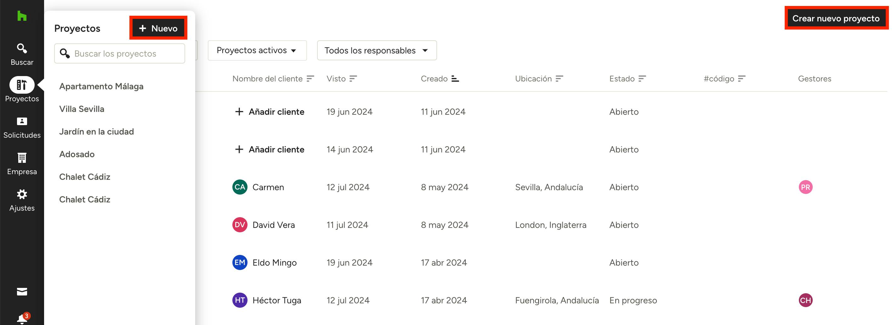 Tu página de Todos los proyectos, accesible haciendo clic en el ícono de Proyectos en la navegación izquierda, te ofrece una visión general de cada proyecto, junto con detalles clave como cliente, ubicación, estado, tipo y responsable.