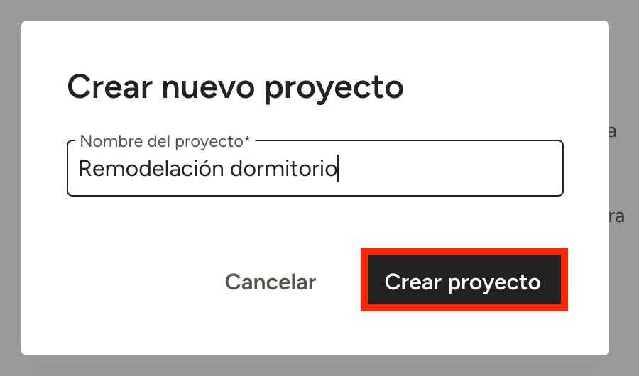 Solo tienes que introducir el nombre del proyecto para crearlo. Podrás añadir más adelante el resto de detalles, tales como la información del cliente y el presupuesto.