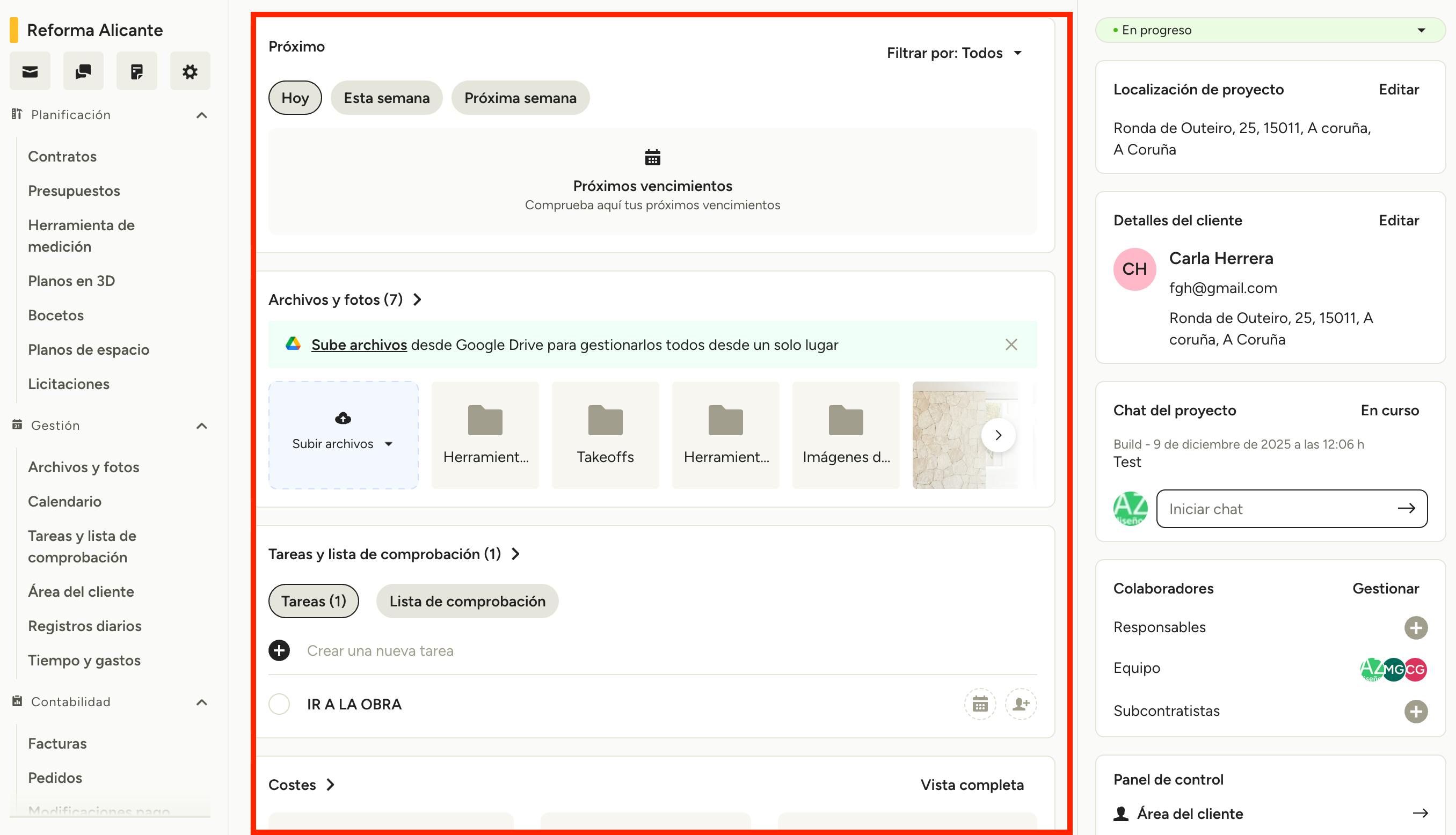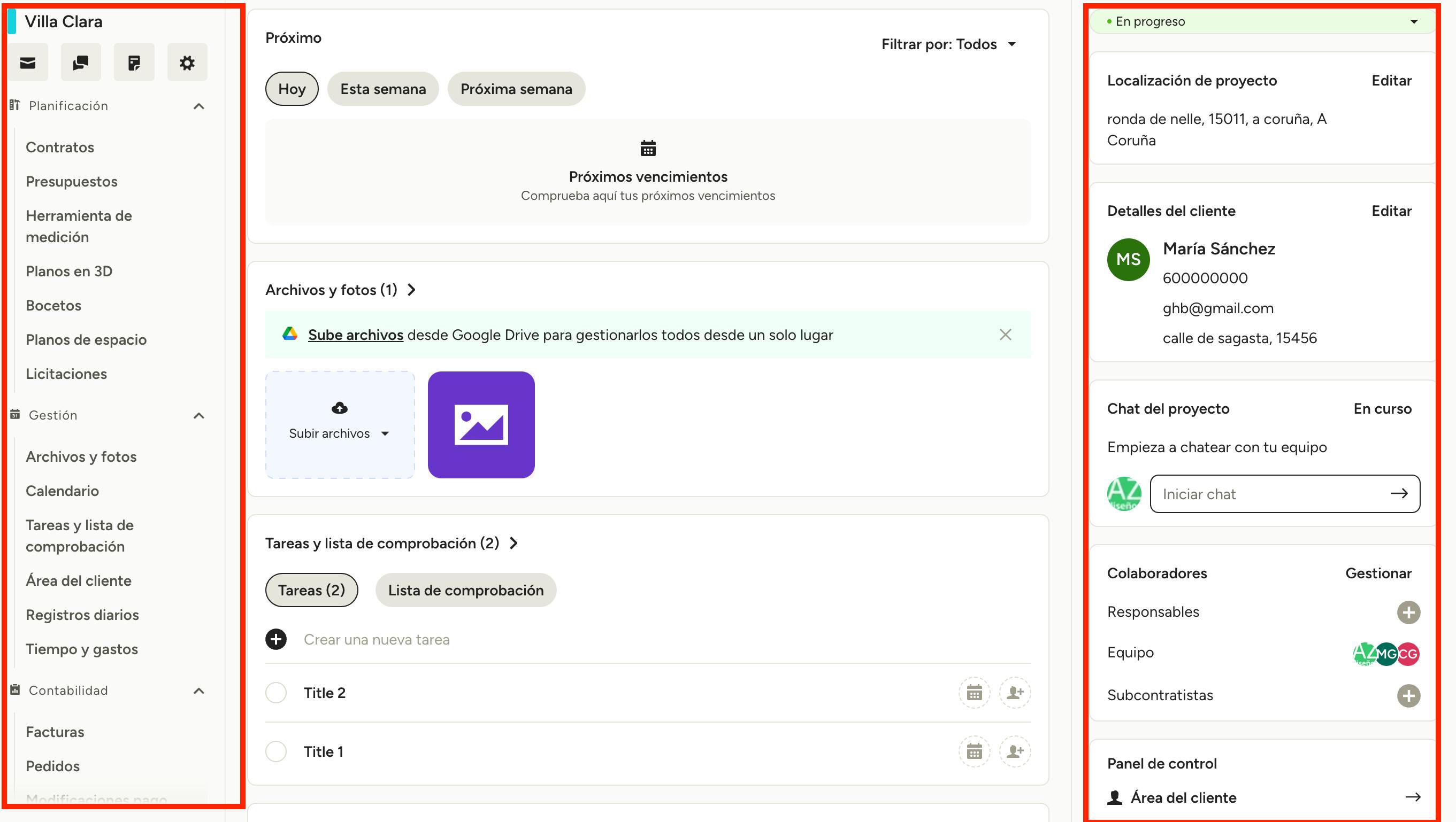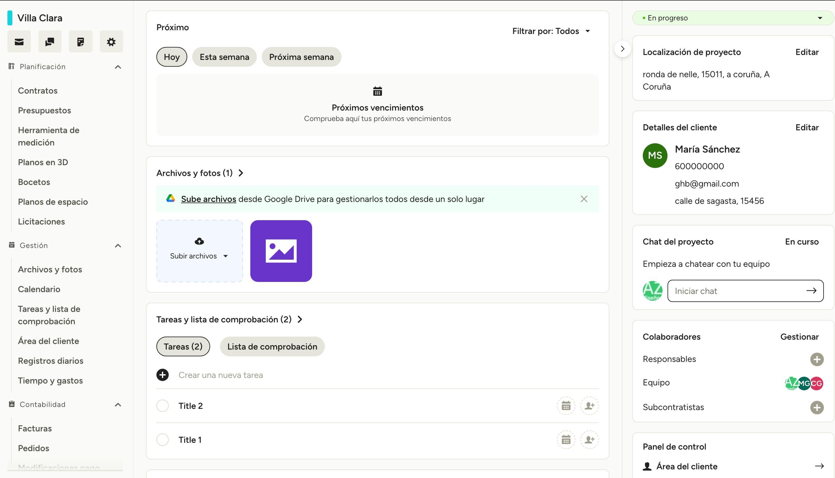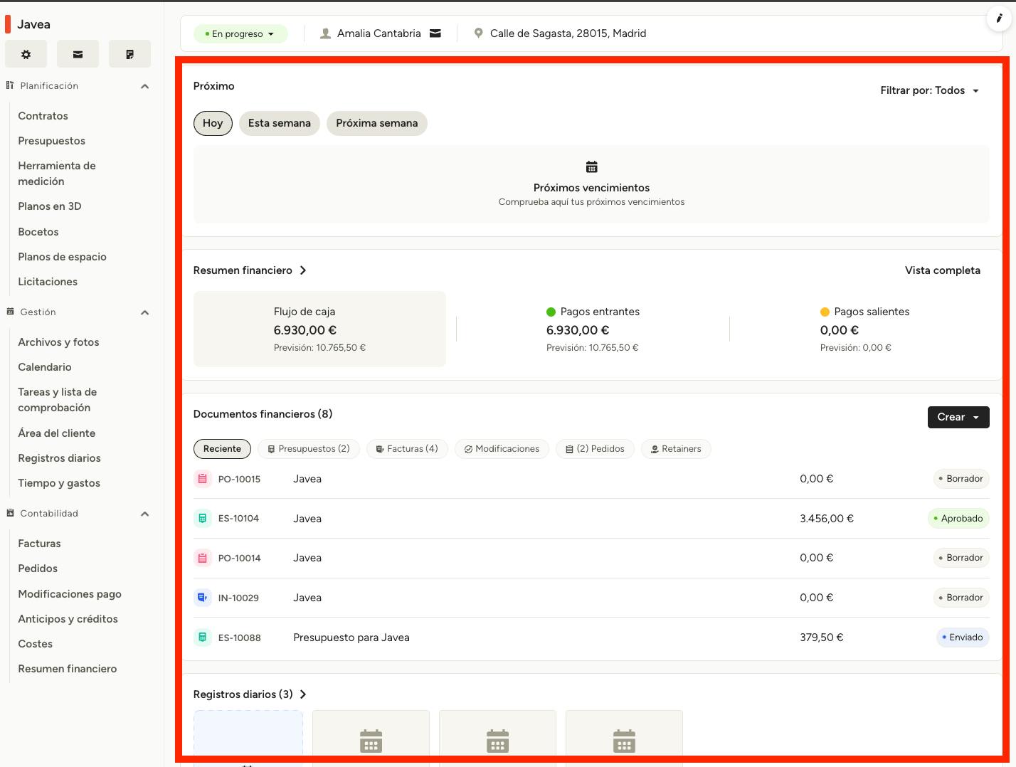 Gestión del proyecto: en esta sección, puedes organizar los detalles del proyecto con Archivos y fotos, Calendario, Tareas y lista de comprobación, Área del cliente, Registros diarios y Tiempo y gastos.