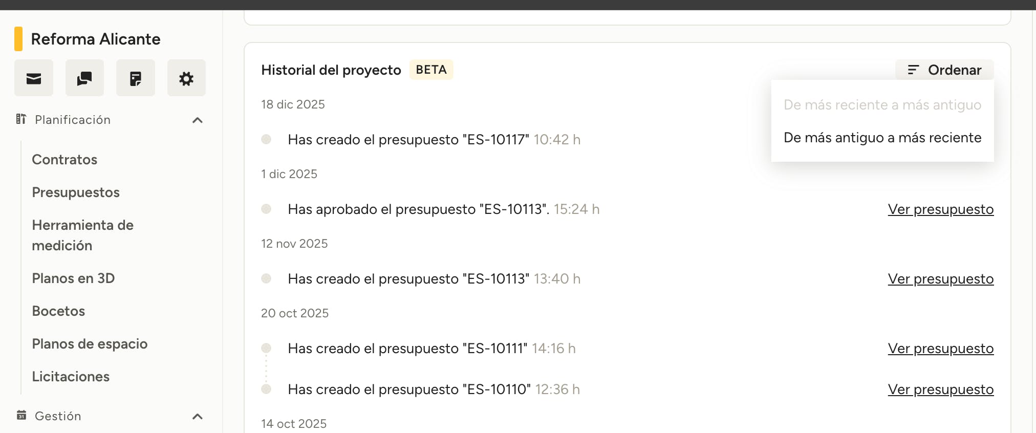 Puedes hacer clic en la acción a la derecha de cada actividad para ir directamente a la funcionalidad en la que se encuentra, además de ordenar el historial de actividades de más reciente a más antiguo o al contrario en el menú Ordenar que se encuentra en la parte superior.