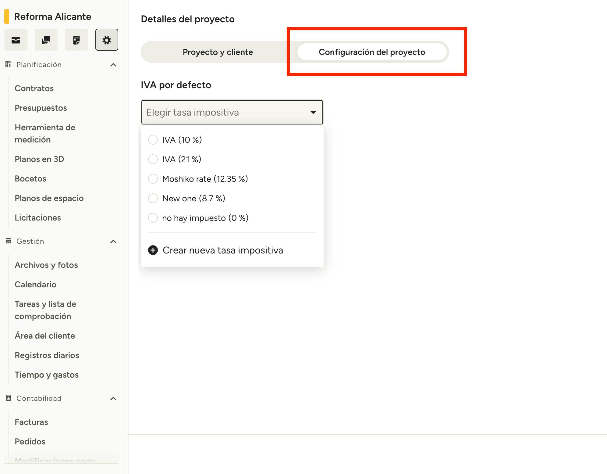En la pestaña Configuración del proyecto, puedes establecer un impuesto predeterminado para el proyecto que se aplicará a todos los nuevos documentos financieros dentro del proyecto individual. Leer más Cómo configurar impuestos