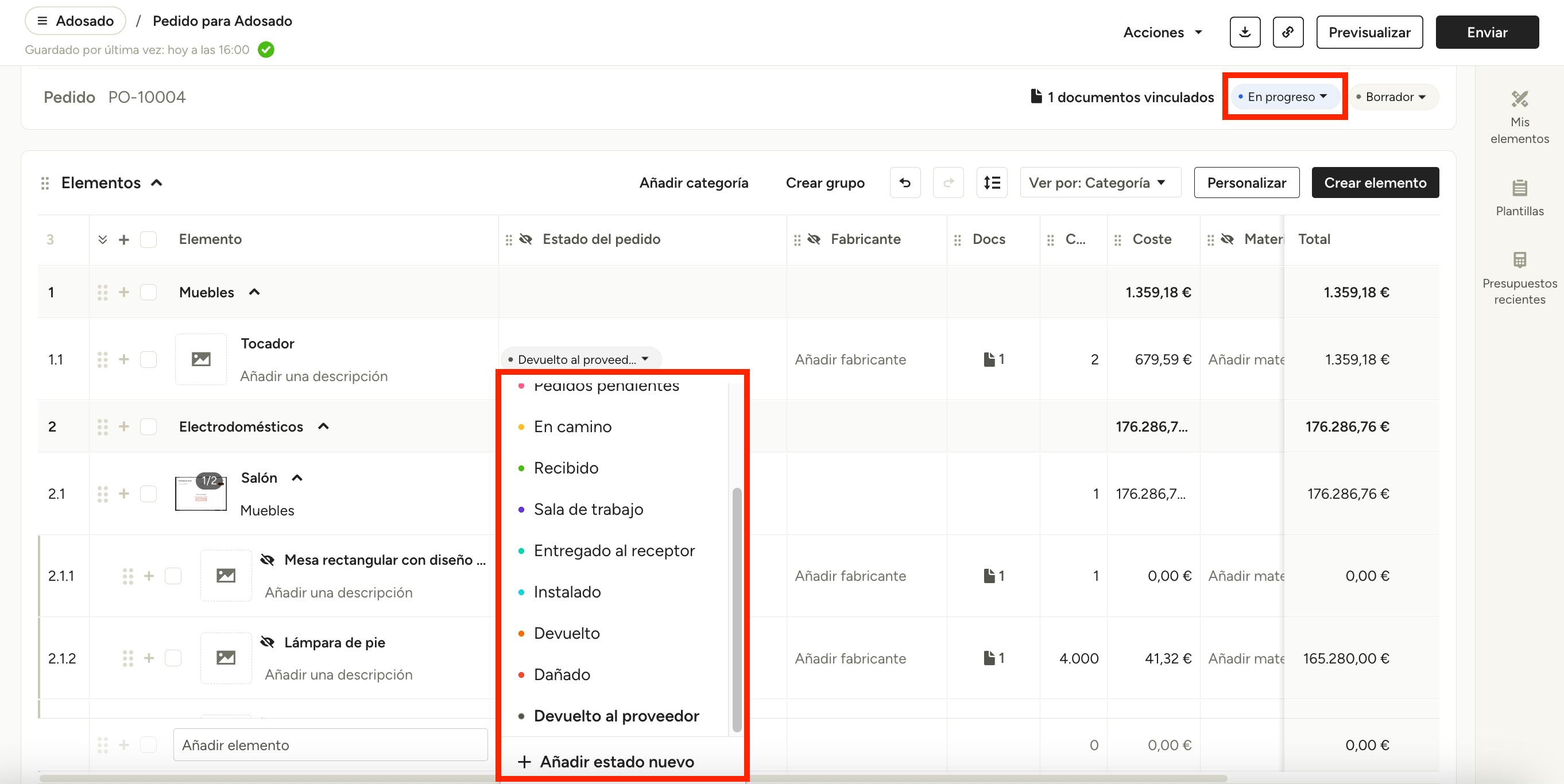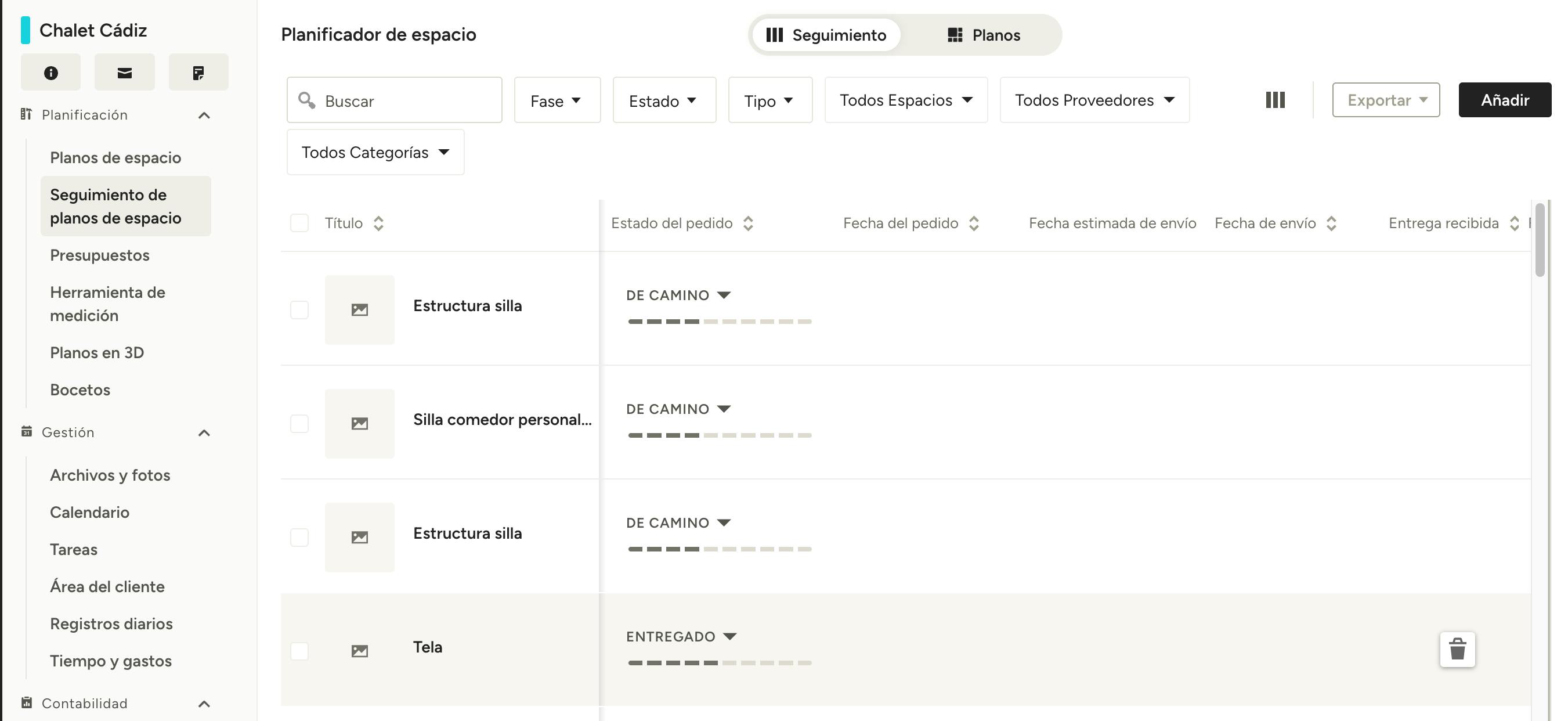 Los estados por elemento aparecerán reflejados en el Seguimiento del proyecto. Si realizas cambios en el estado del pedido desde esta sección, se actualizará el pedido, y viceversa.
