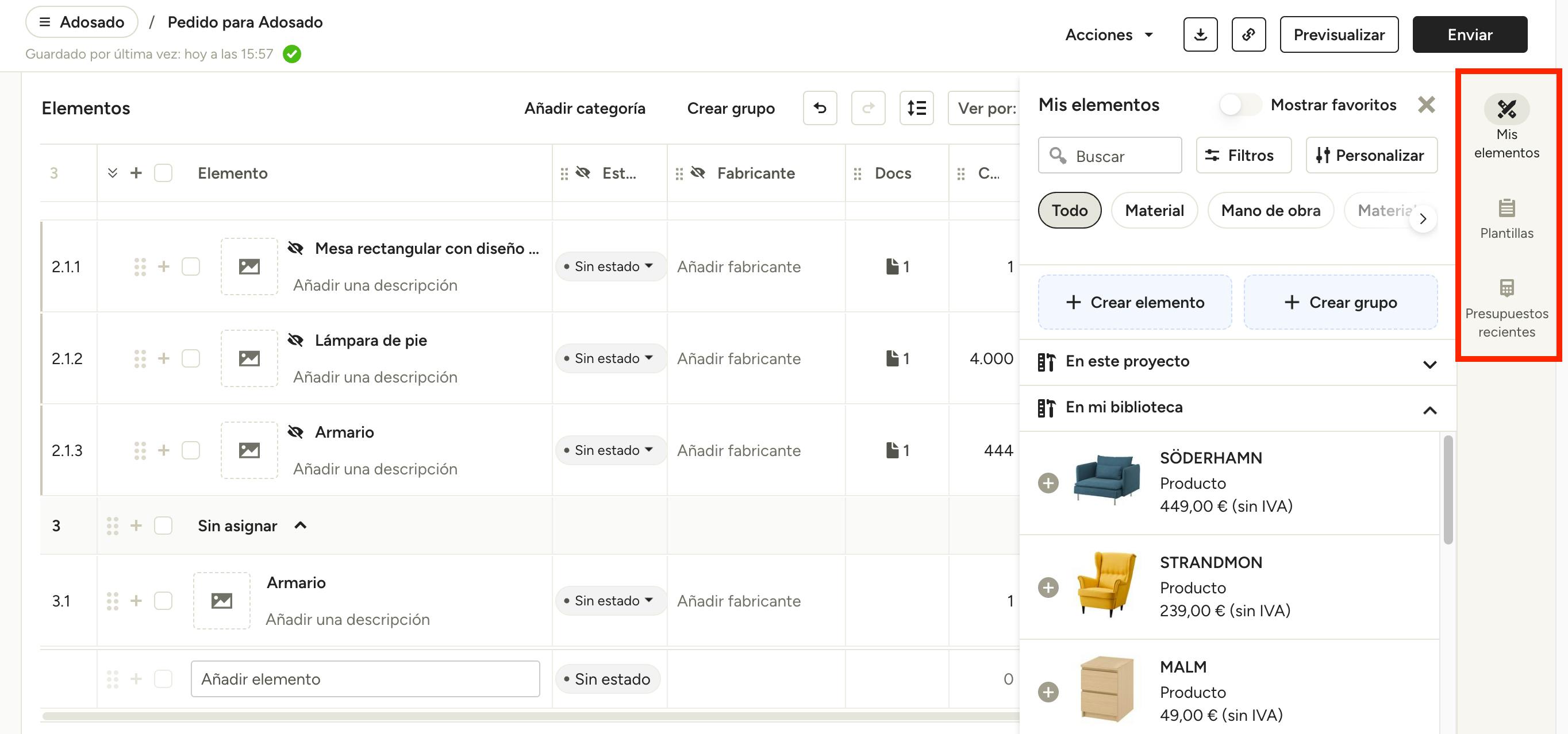 - Presupuestos recientes: Elementos de otros documentos financieros de tus proyectos.