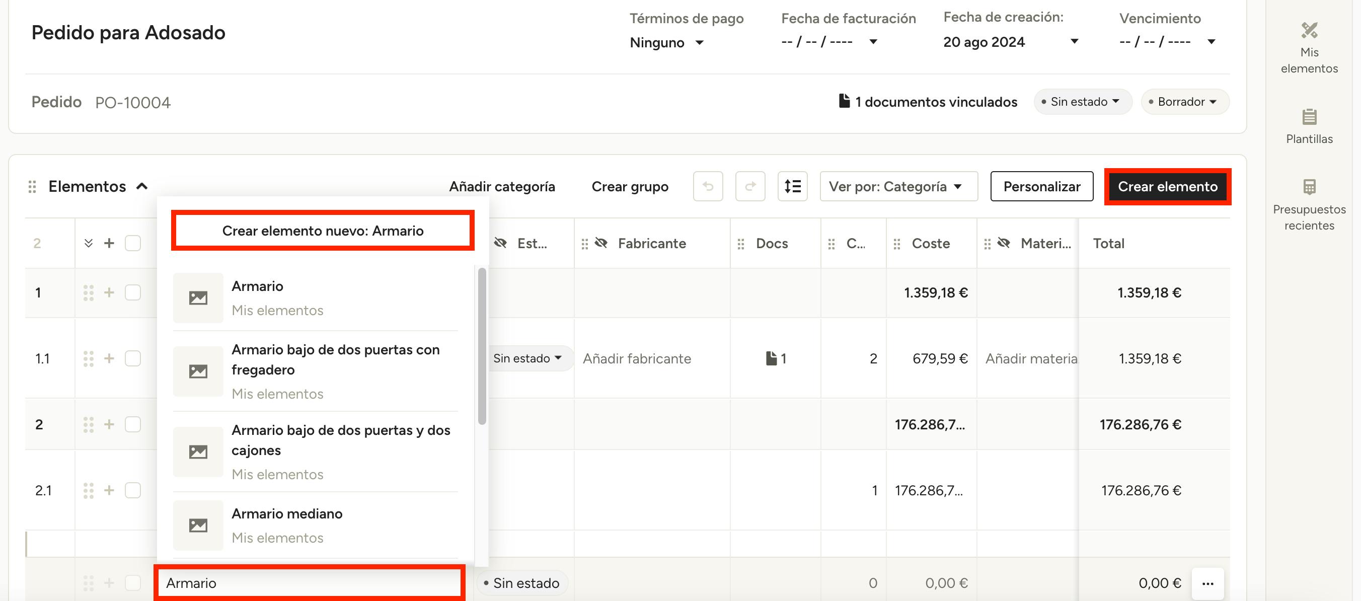 Para añadir elementos a un pedido, haz clic en el campo Añadir elemento del documento para introducir la información de forma manual. Aquí puedes crear un elemento nuevo o buscar y seleccionar uno existente. Verás las secciones Mis elementos y Elementos del proyecto debajo de cada elemento, especificando así de dónde proceden. Haz clic en el elemento que quieras añadir. Después puedes hacer clic en la columna que desees para modificar los detalles, como la cantidad o el coste.