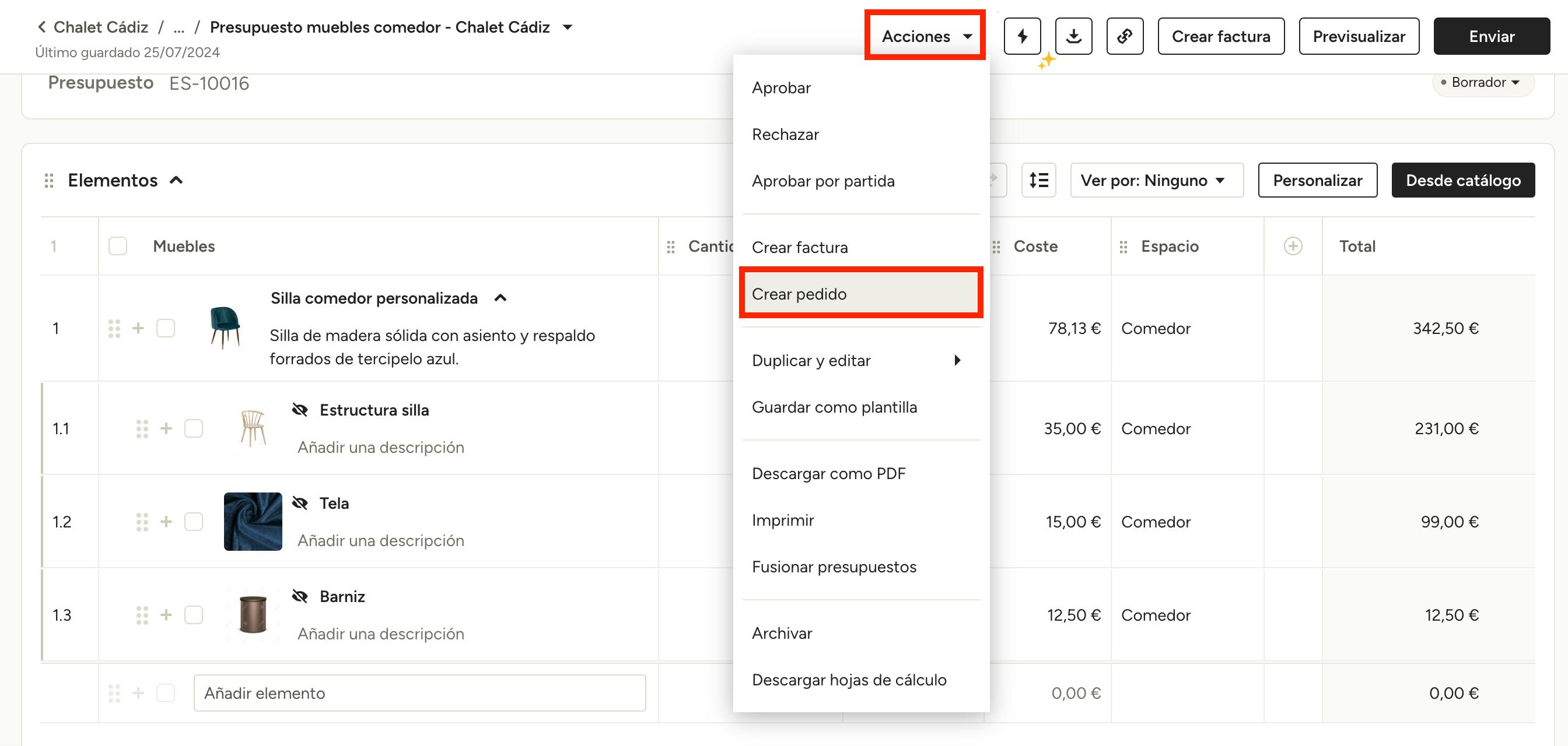 1. Marca las partidas que quieras incluir y selecciona Acciones > Crear pedido.