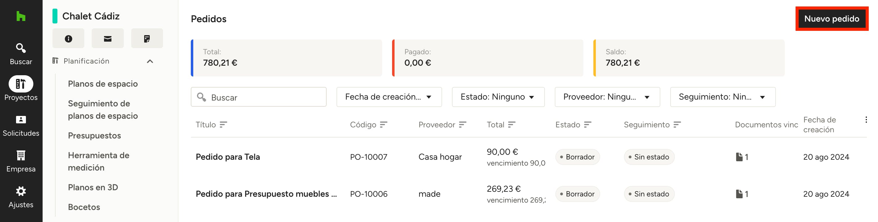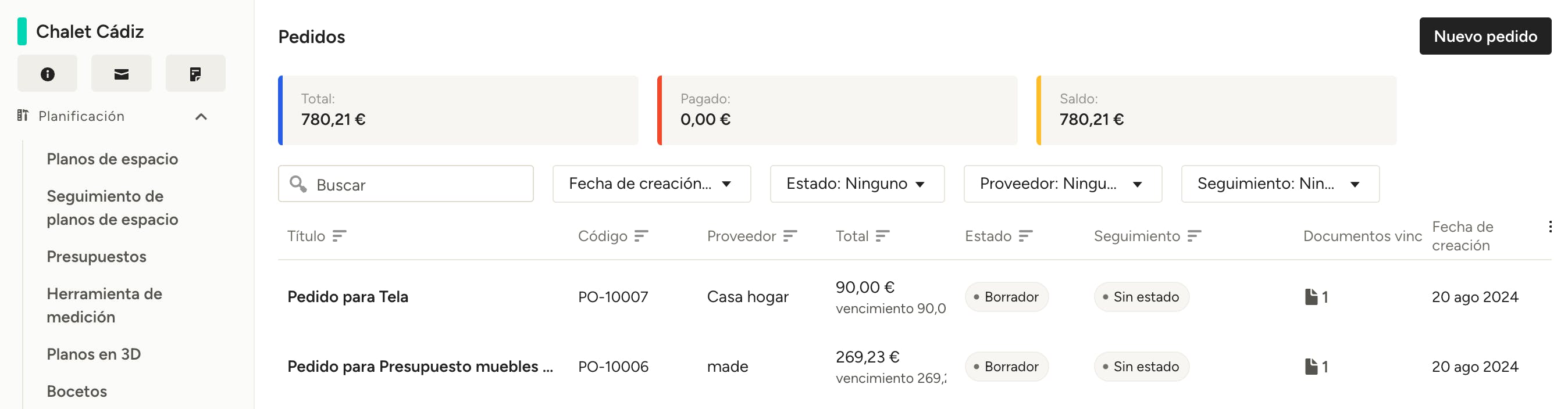 Si creas pedidos para varios proveedores o subcontratistas, se te redirigirá a la sección de Pedidos del proyecto para que puedas verlos todos.