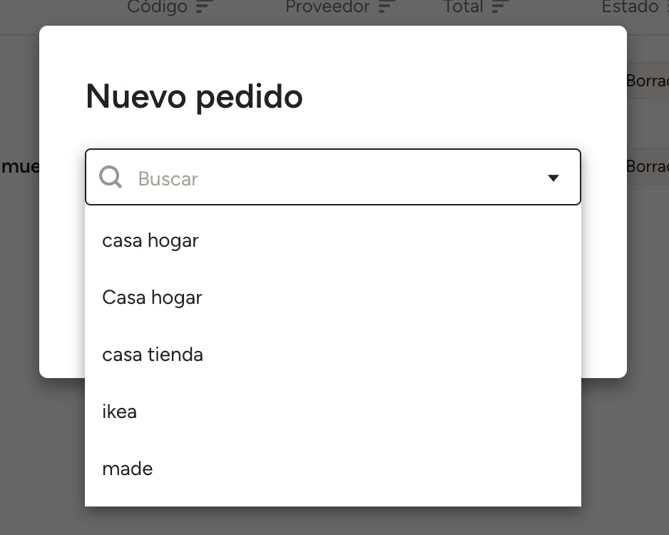 A continuación se abrirá un cuadro en el que puedes elegir el proveedor para el pedido. Búscalo por nombre o selecciona uno de la lista. Sus detalles de envío y facturación se generarán automáticamente, si bien puedes añadir una dirección de envío personalizada o editar los detalles de facturación y envío existentes directamente en el pedido nuevo.