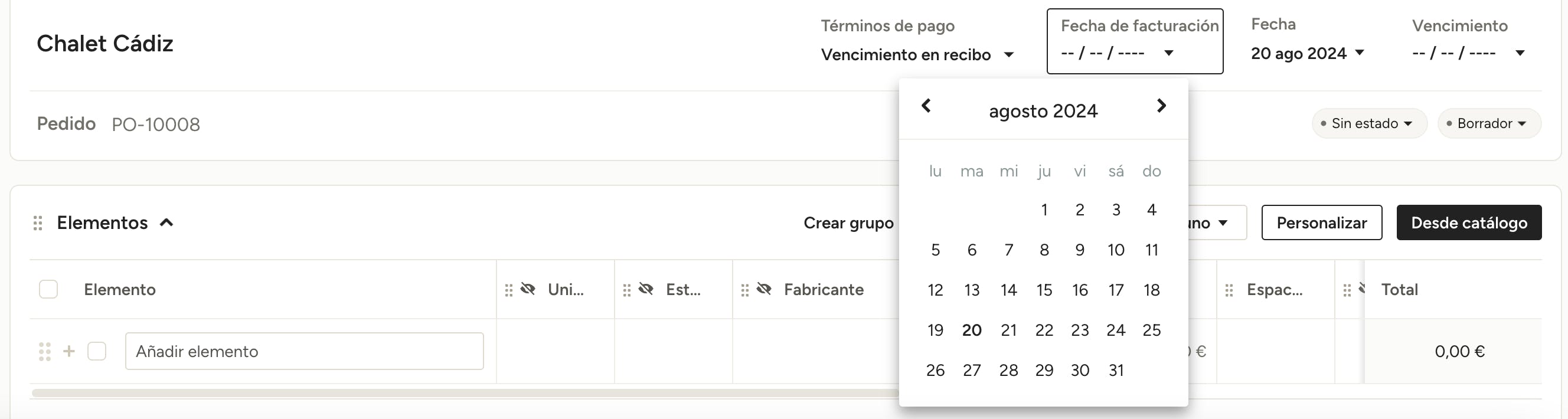 Haz clic en Crear para empezar a añadir los elementos y editar el pedido.