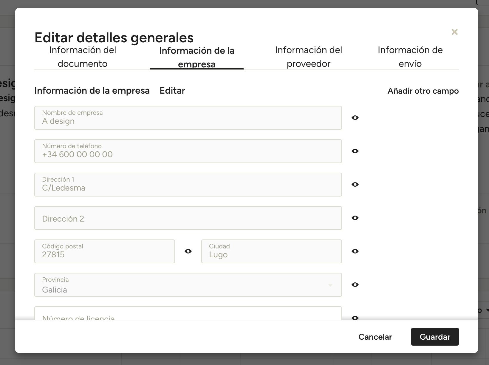 Para editar la información general del documento, incluidos los detalles del mismo, de la empresa, del vendedor y de envío, puedes hacer clic en cada sección para modificarla o bien seleccionar el icono con forma de lápiz que aparece en la parte superior derecha de cada una.