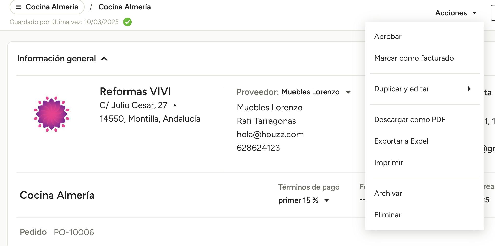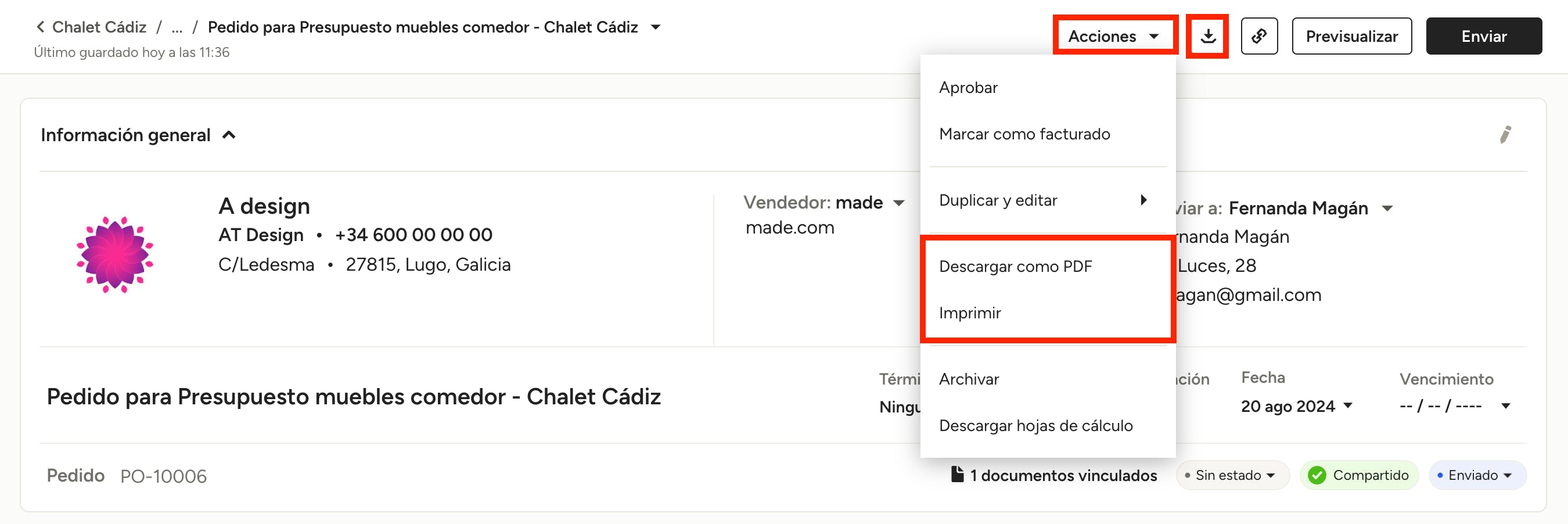 Además de previsualizar y enviar tu pedido desde la barra de herramientas superior, también puedes utilizar el menú Acciones para Aprobarlo, Marcar como Facturado, Duplicar y Editar, Descargar PDF, Imprimir, Exportar a Excel, Archivar y Eliminar.