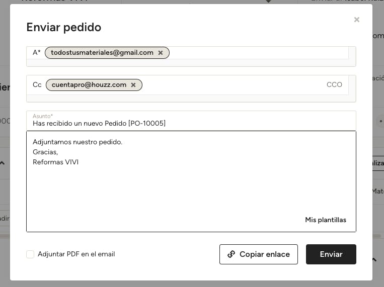 Cuando el pedido esté listo, haz clic en Enviar(desde previsualizar o modo editar). Puedes escribir un mensaje personalizado o usar una de tus plantillas de mensajes. Cuando el proveedor reciba el email, podrá ver el pedido directamente desde su ordenador, teléfono o tablet.