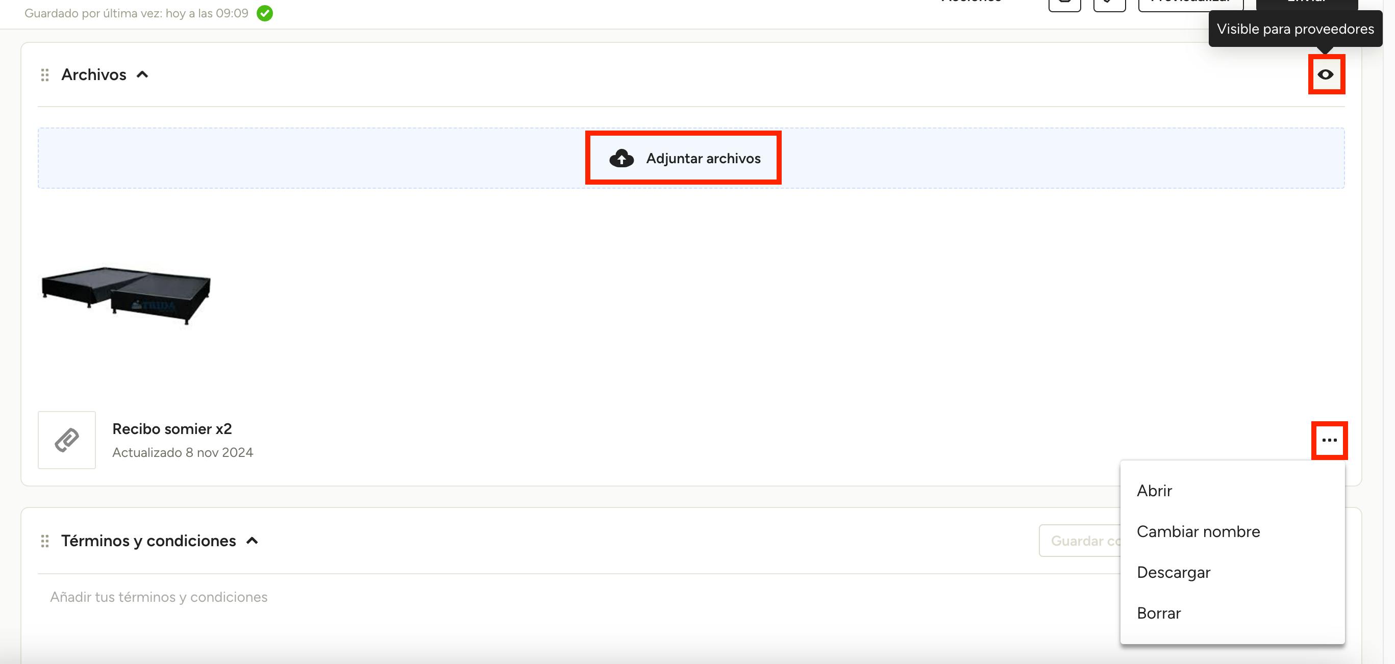 La sección Archivos de los pedidos es un lugar ideal para añadir fotos o especificaciones de los productos que quieras compartir con tu proveedor o subcontratista, así como un rincón interno en el que realizar un seguimiento de los recibos, facturas o confirmaciones de pedidos de los proveedores o subcontratistas. Haz clic en Adjuntar archivos para añadir archivos y fotos de proyectos existentes o para subir otros nuevos desde tu ordenador. Selecciona los archivos adjuntados para acceder a una vista previa, o haz clic en el icono con forma de tres puntos junto al archivo para cambiarle el nombre, descargarlo o eliminarlo.