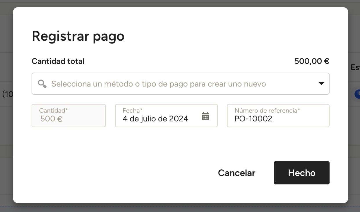 Para registrar un pago, haz clic en el botón Registrar pago que aparece junto a la derecha de cada uno. Se abrirá un cuadro en el que podrás elegir el método de pago, la fecha y el número de referencia (este es un lugar óptimo para registrar un número de pedido o de confirmación). Haz clic en Hecho para registrar los detalles del pago.
