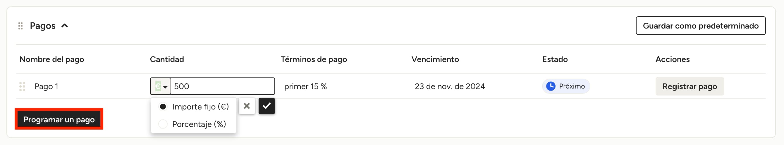 Por defecto, el primer pago se configurará con el importe completo del pedido. Puedes añadir varios pagos a través del botón Programar un pago. Haz clic en cada pago para editar el nombre, la cantidad, los términos y su vencimiento.