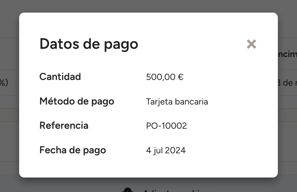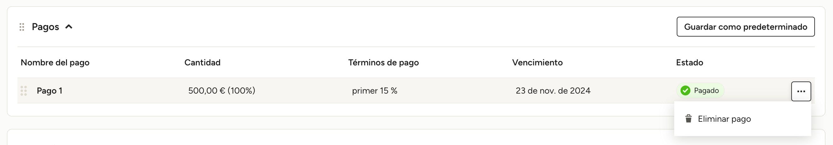 Ahora la columna Estado mostrará Pagado junto al pago registrado. Haz clic en el nombre del pago para visualizar sus detalles, incluidos el método de pago y el número de referencia. Para eliminar un pago, haz clic en el icono con forma de tres puntos que aparece a la derecha y selecciona Eliminar pago.