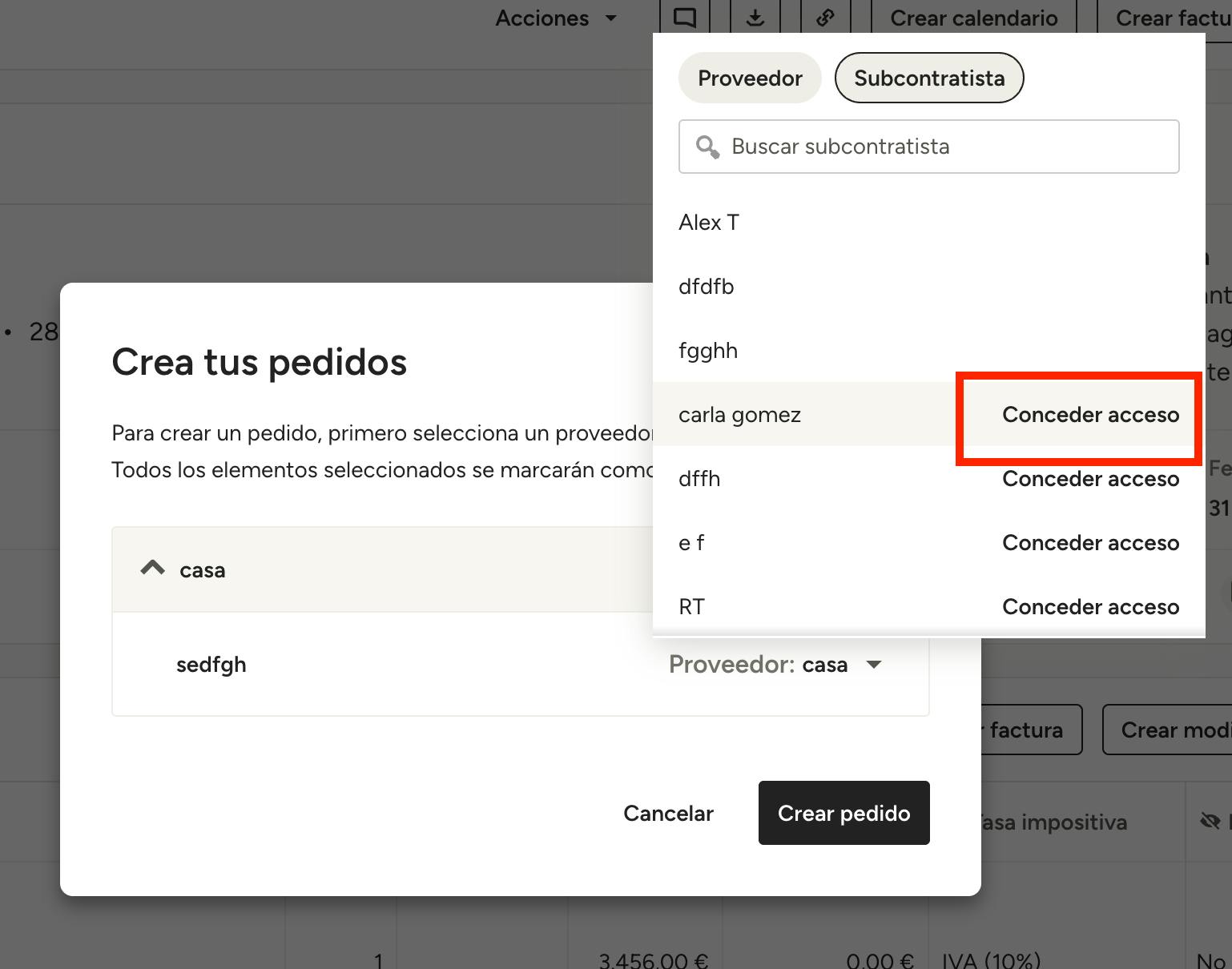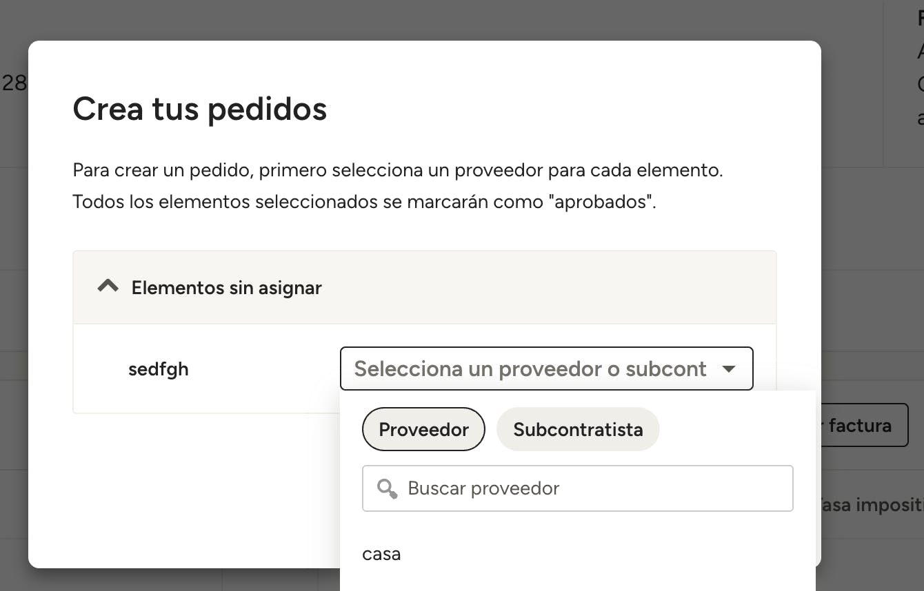 Si solo creas un pedido para un único proveedor o subcontratista, accederás directamente a dicho pedido.