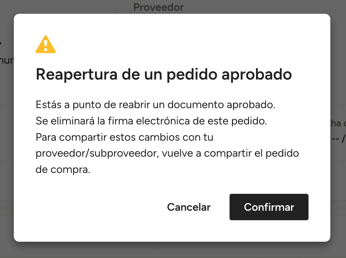 Una vez aprobado, deberás volver a abrirlo si es necesario realizar cambios. El proveedor o subcontratista no recibirá ninguna notificación de que has vuelto a abrir el pedido para editarlo hasta que vuelvas a compartirla con ellos.