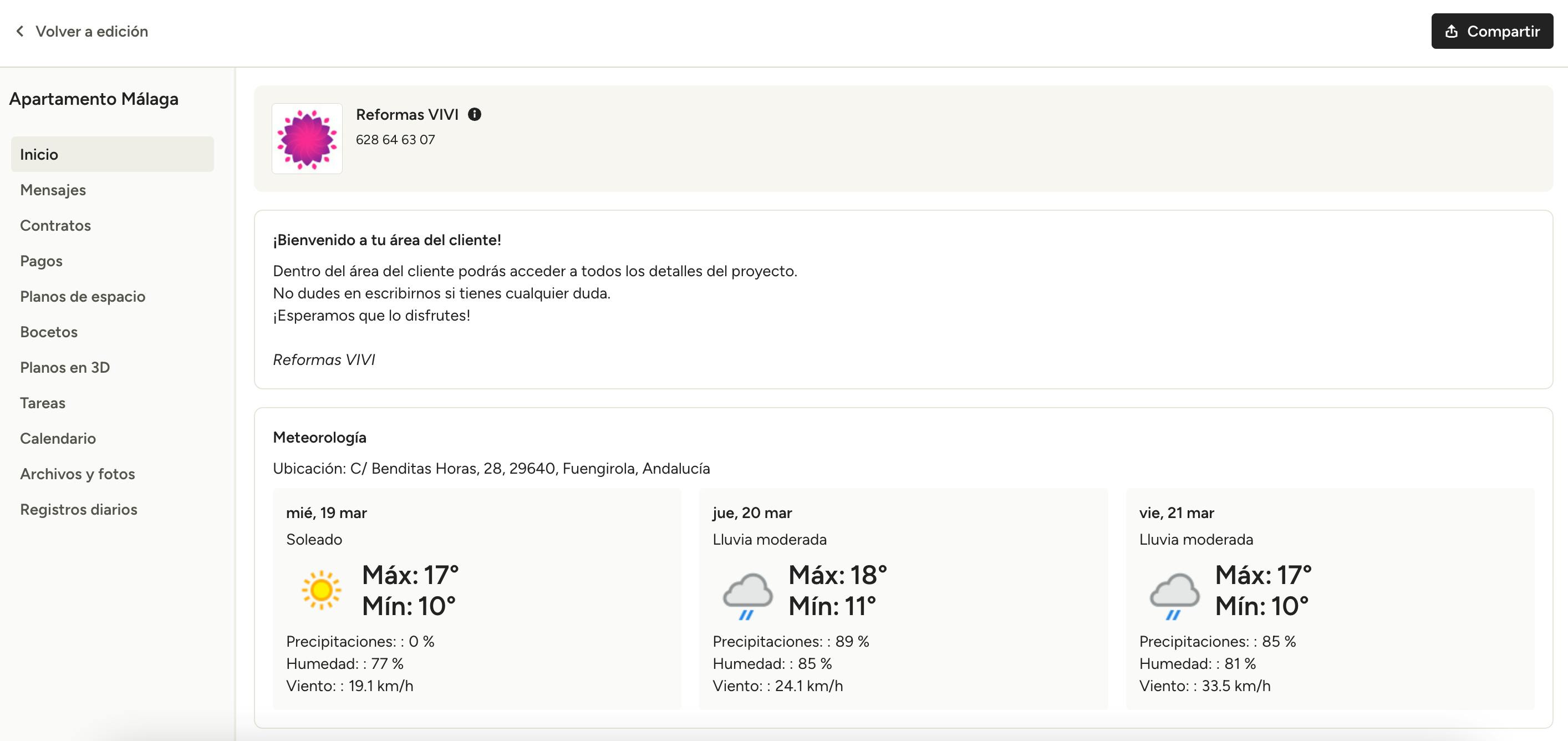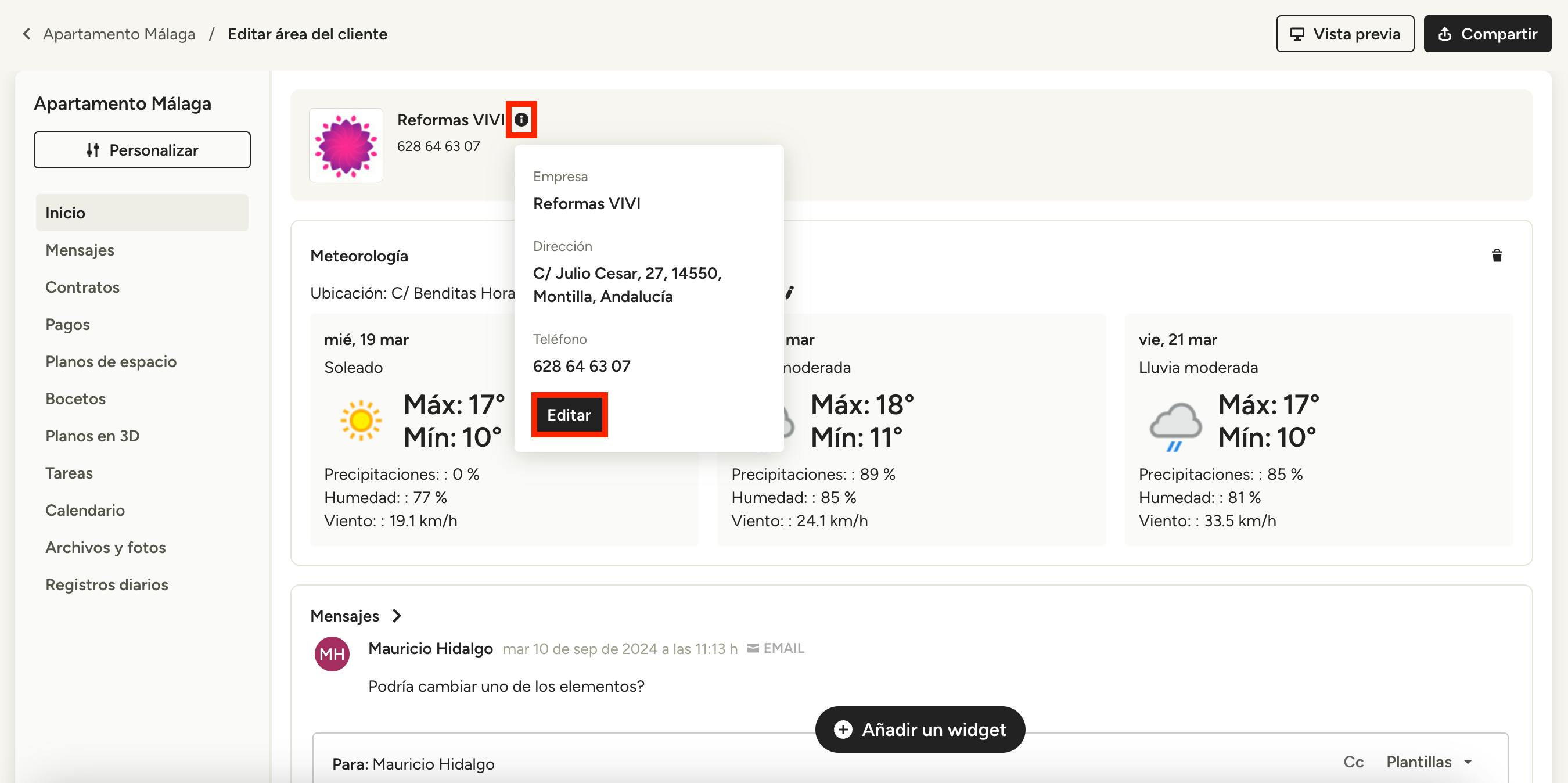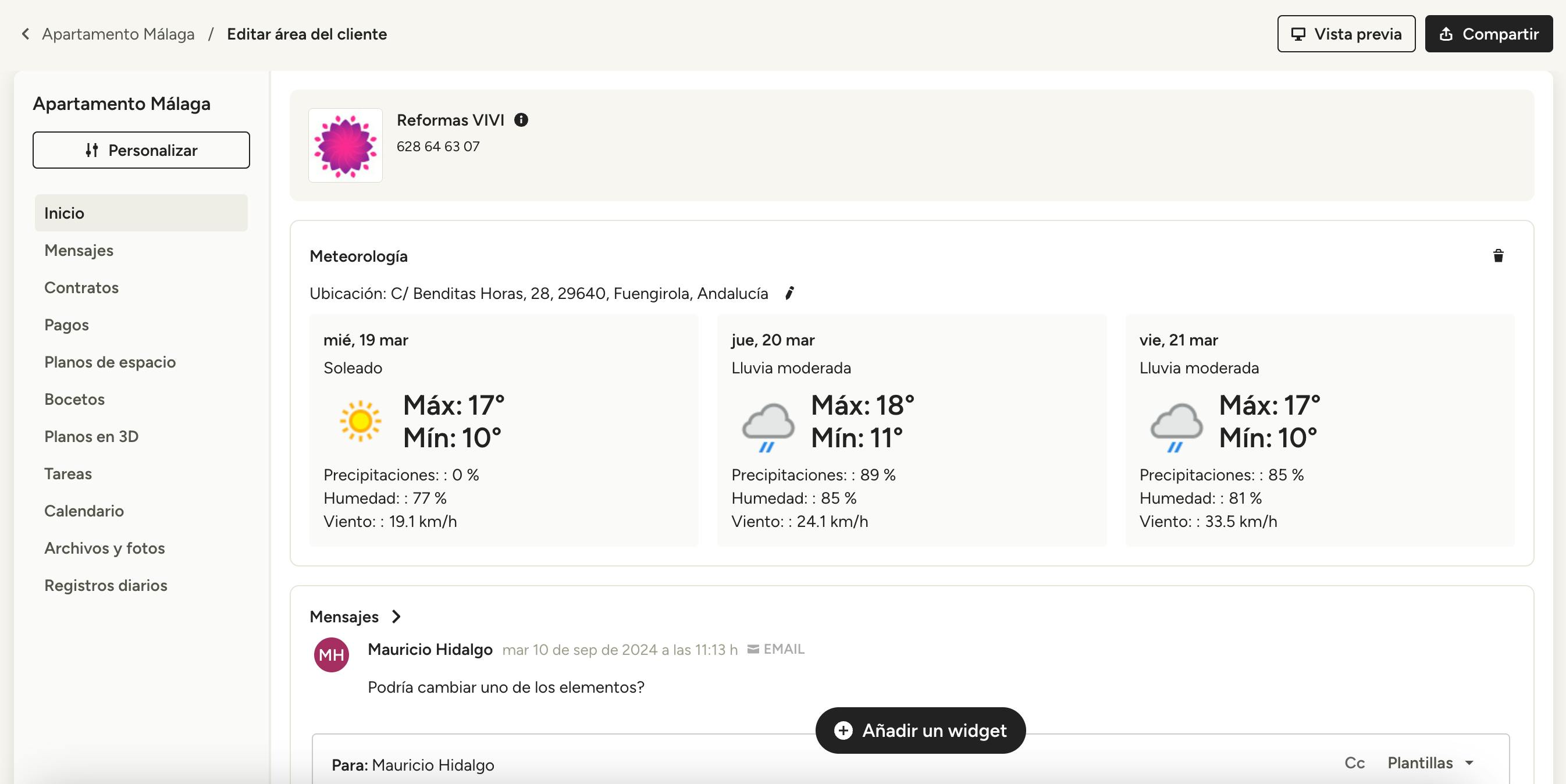 Si seleccionas Climatología, puedes mostrar un resumen del clima en la ubicación del proyecto: solo tienes que añadir el código postal de la localización para actualizar los datos con la información local. Estos detalles ayudarán a que el cliente esté al tanto sobre las condiciones meteorológicas que pueden retrasar o afectar al calendario del proyecto.
