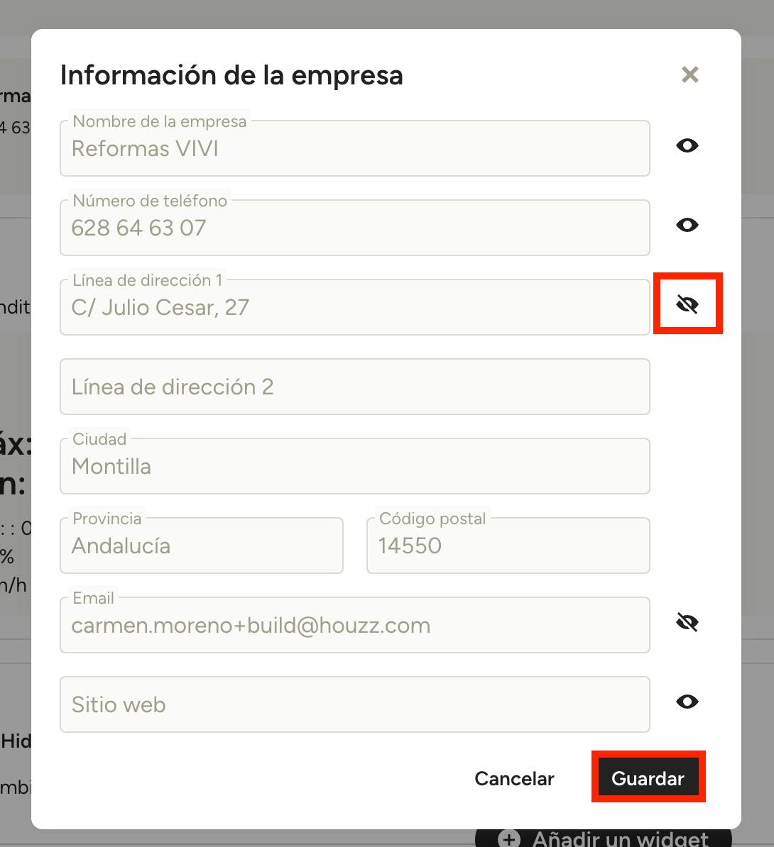 Dentro del modo de edición, selecciona el icono con forma de ojo para ocultar los campos que quieras. Por ejemplo, si el ojo está tachado junto a la dirección, esta no se mostrará en el área del cliente.
