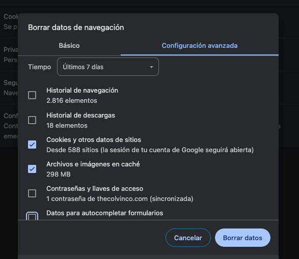 Borrar caché y cookies