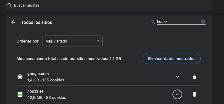 - Escribe "Houzz" en la barra de búsqueda y haz clic en Eliminar datos mostrados