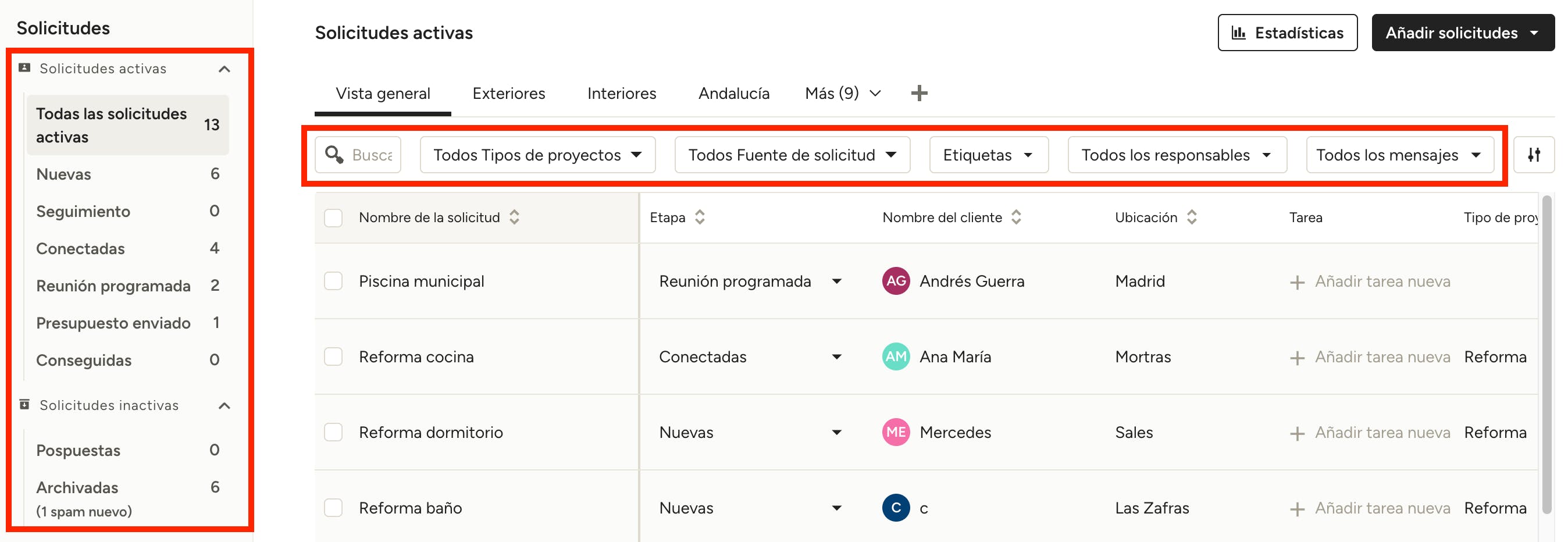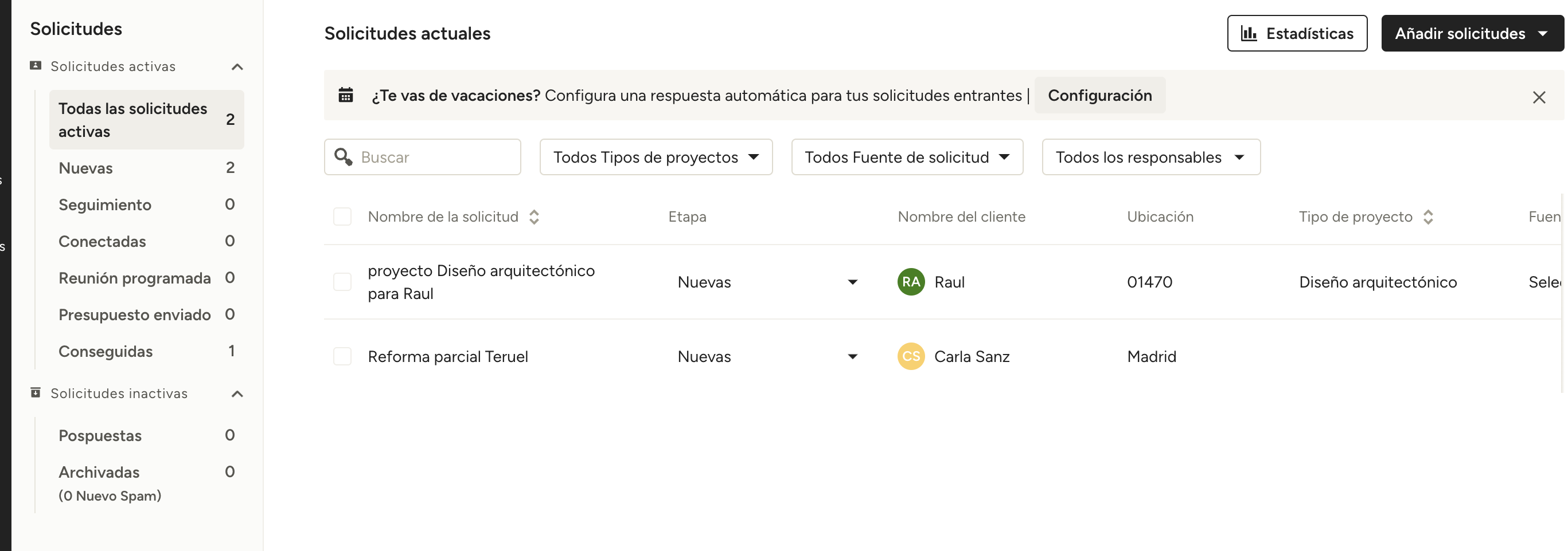 A continuación, te mostramos cómo consultar, editar y eliminar tus solicitudes, cómo convertirlas en proyectos, cómo crear solicitudes nuevas y cómo modificar algunos datos clave, como la fuente de la solicitud o la fase en la que se encuentra.