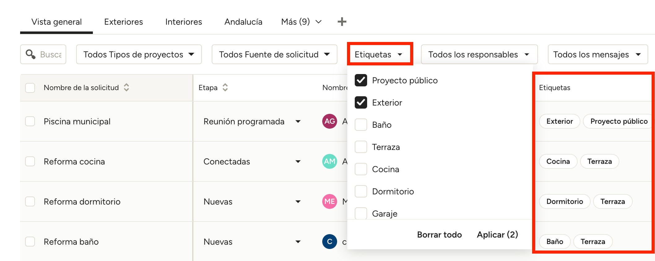 Una vez que hayas aplicado una o más etiquetas a una solicitud, las verás en la columna Etiquetas de la lista principal de solicitudes. Para filtrar tus solicitudes rápidamente mediante una etiqueta, haz clic en la etiqueta en cuestión y los resultados se filtrarán automáticamente. También puedes usar el filtro Etiquetas en la parte superior de la lista para filtrar por una o más etiquetas.