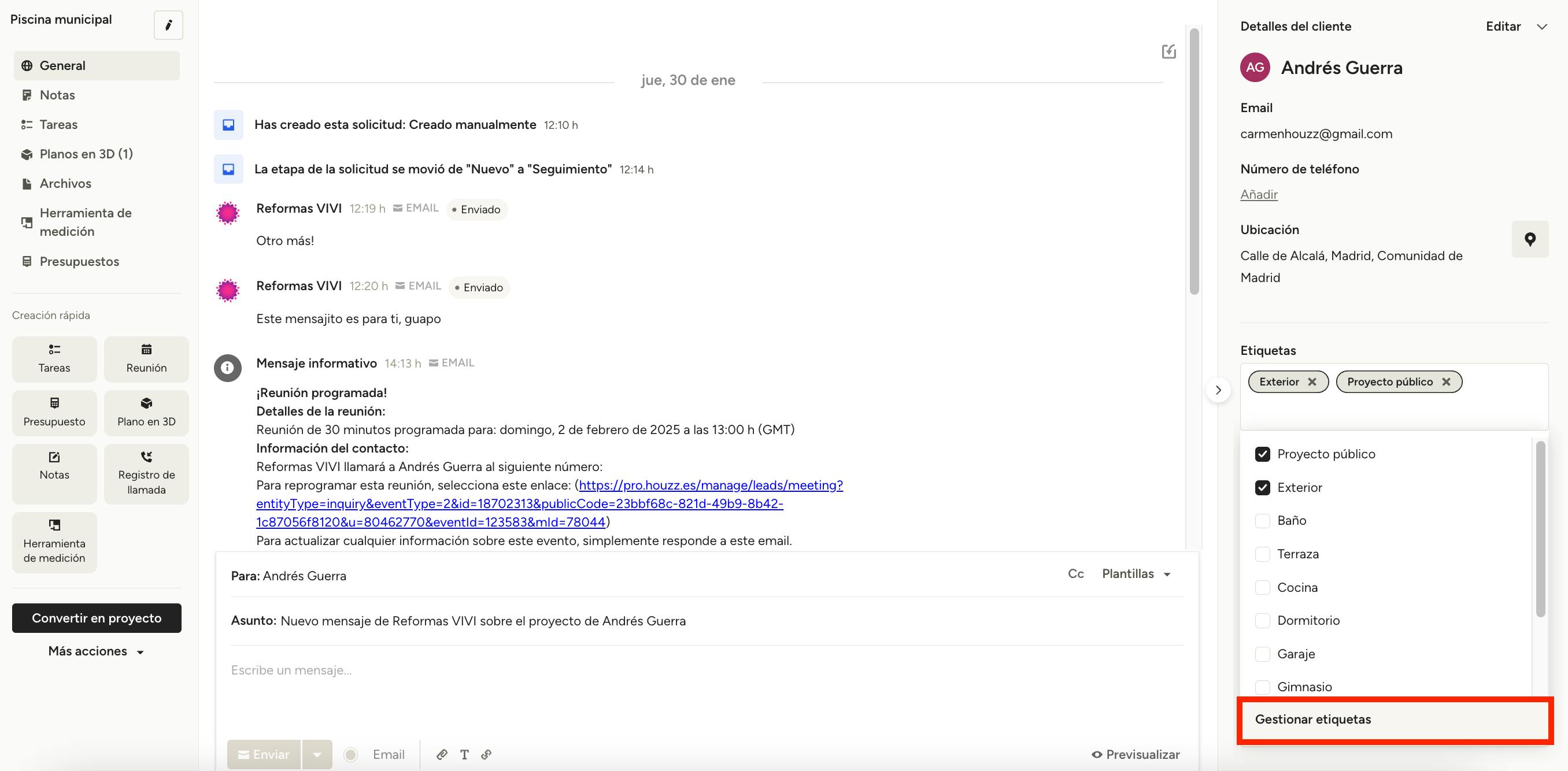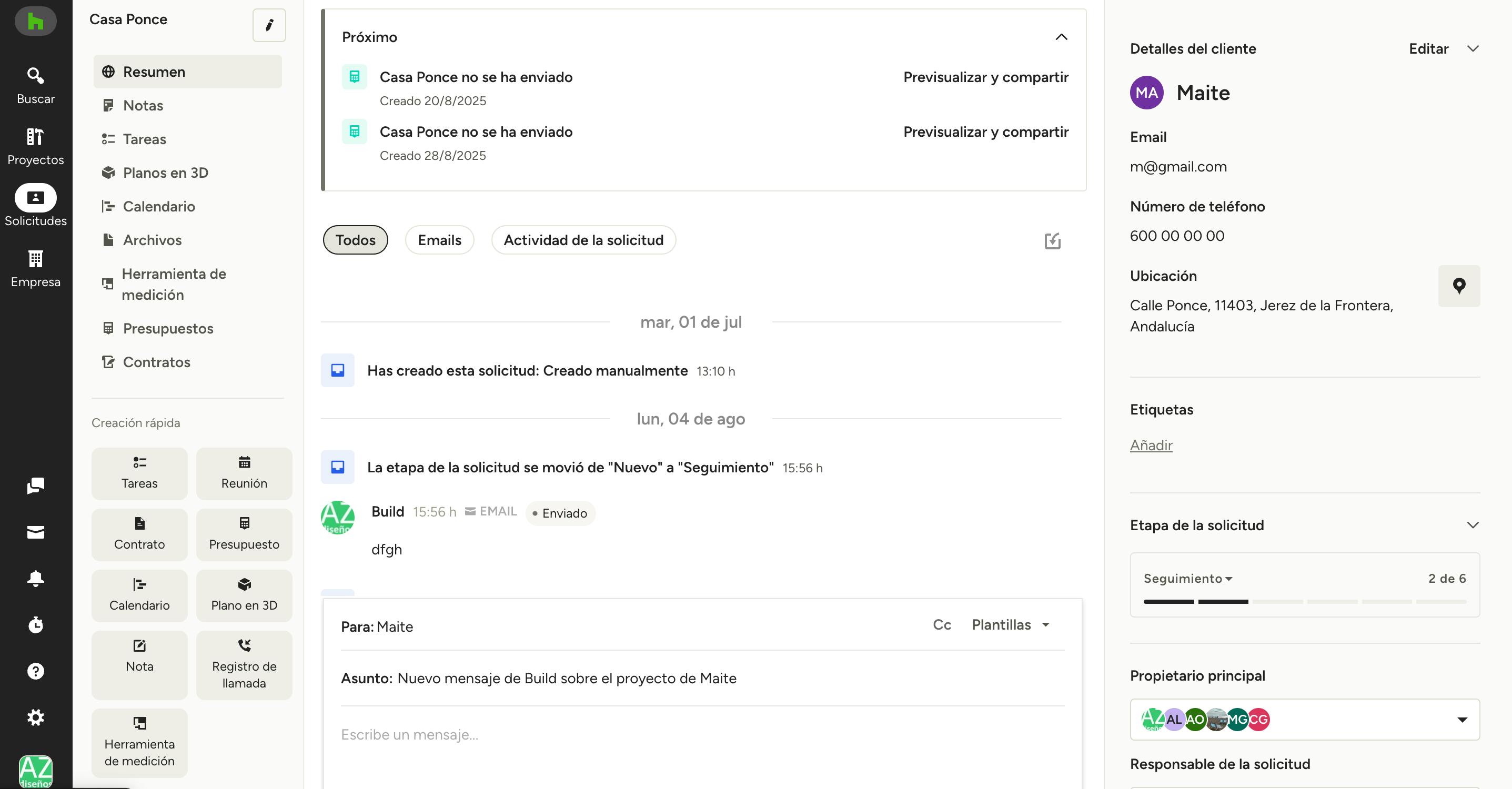 Accede a la sección «General» para comunicarte directamente con tu cliente potencial: puedes enviarle un correo electrónico o un mensaje de texto. Más abajo podrás consultar todos los mensajes que habéis intercambiado y, desde el menú «Crear rápido», tendrás la opción de crear un nuevo cuestionario, una reunión o un plano en 3D, entre otras opciones.